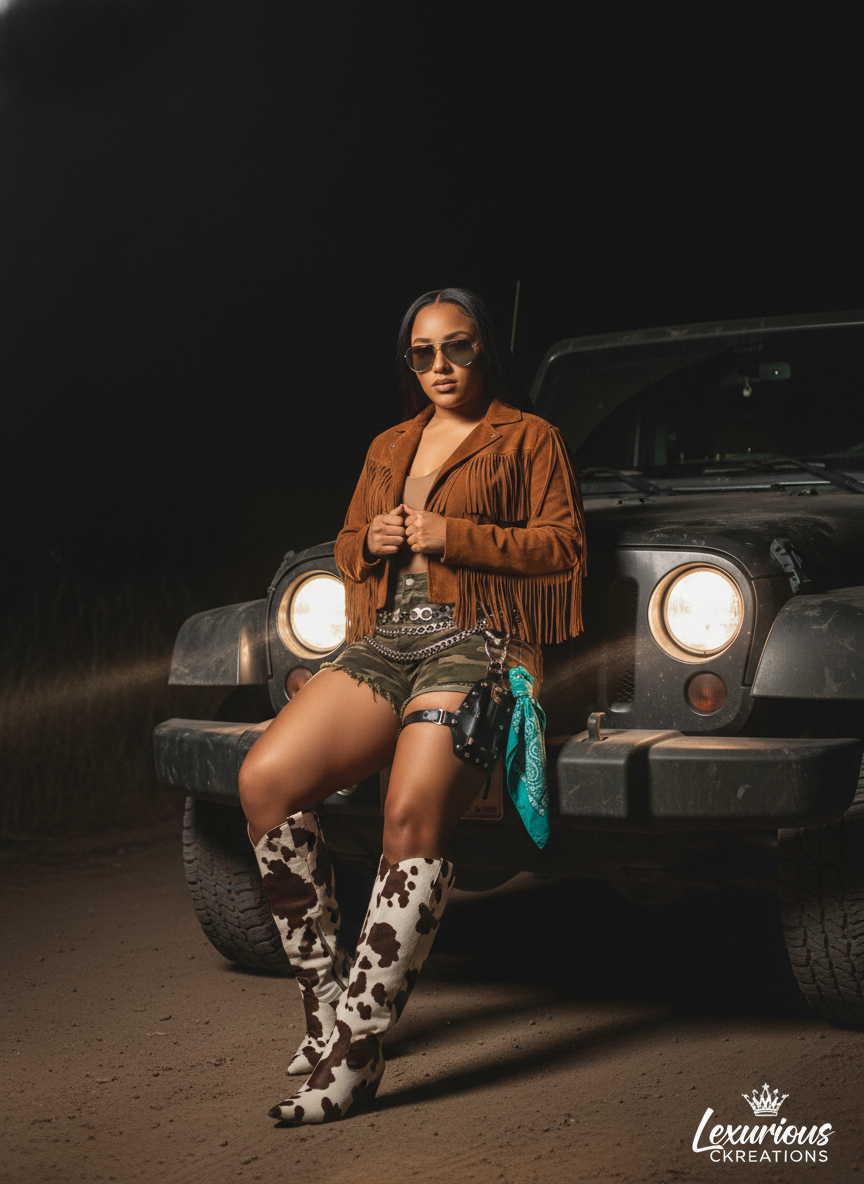 Imagine floor-length faux fur coats paired with leather riding boots, designer-clad equestrians on majestic horses, and high-fashion poses beside massive, glowing bonfires. These prompts deliver photorealistic, editorial-grade results featuring thick, curvy silhouettes set against starry night skies and sun-drenched trails.