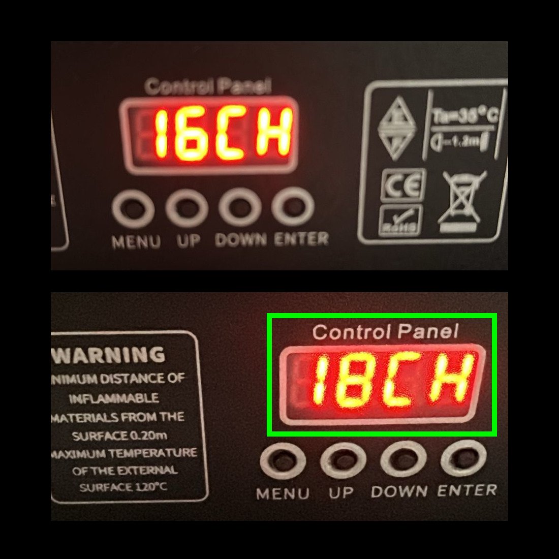 * Verifique, desde el display del equipo, que el menú "CHnd" muestre los modos "16CH" y "18CH" (tercer foto).