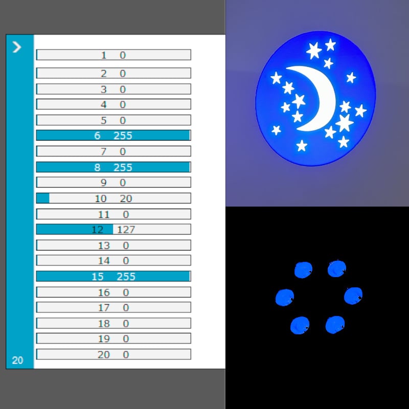 * En el modo de 18CH Verifique, con un Fixture de pruebas de 20CH (click), que coincidan estos canales: 6 Dimmer general, 8 Dimmer de la parte Spot, 10 en el valor 20 = Gobo de la cuarta foto, 12 Foco (mover hasta ver el Gobo), 15 Azul de los leds Wash.