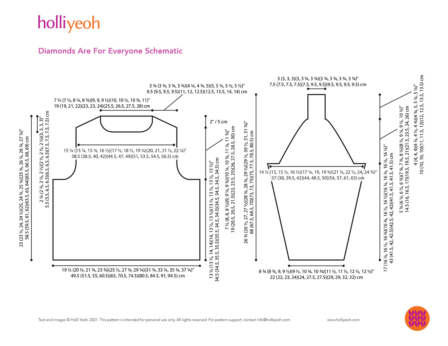 This knitting pattern includes written directions, both charts and written instructions for stitch patterns, front and back images, and detailed schematic with measurements.
