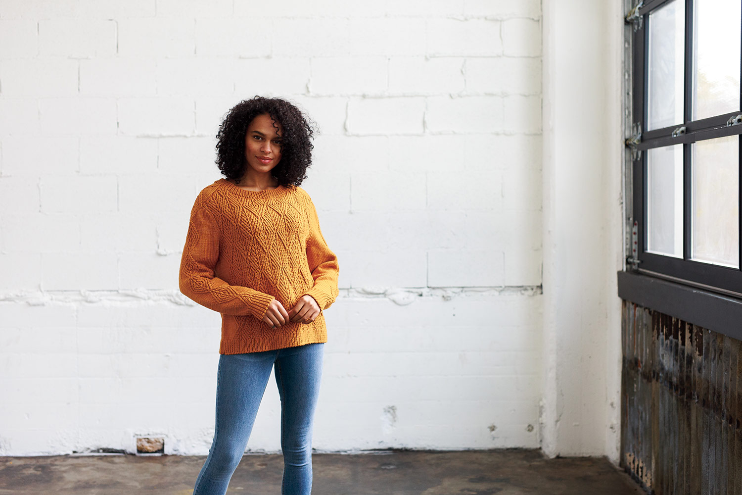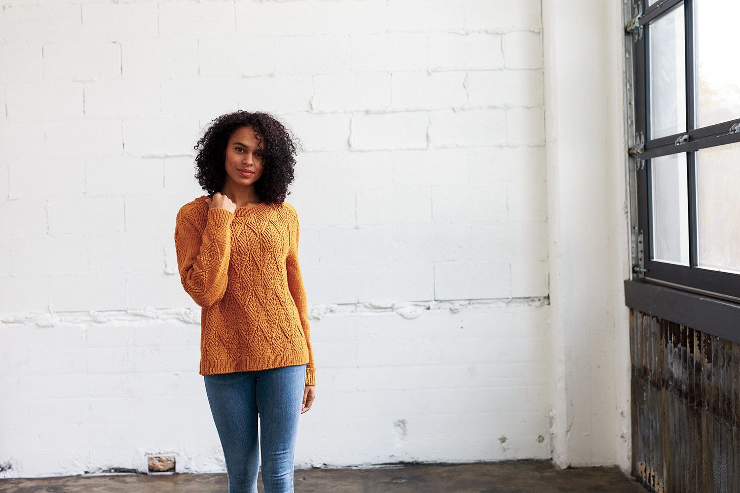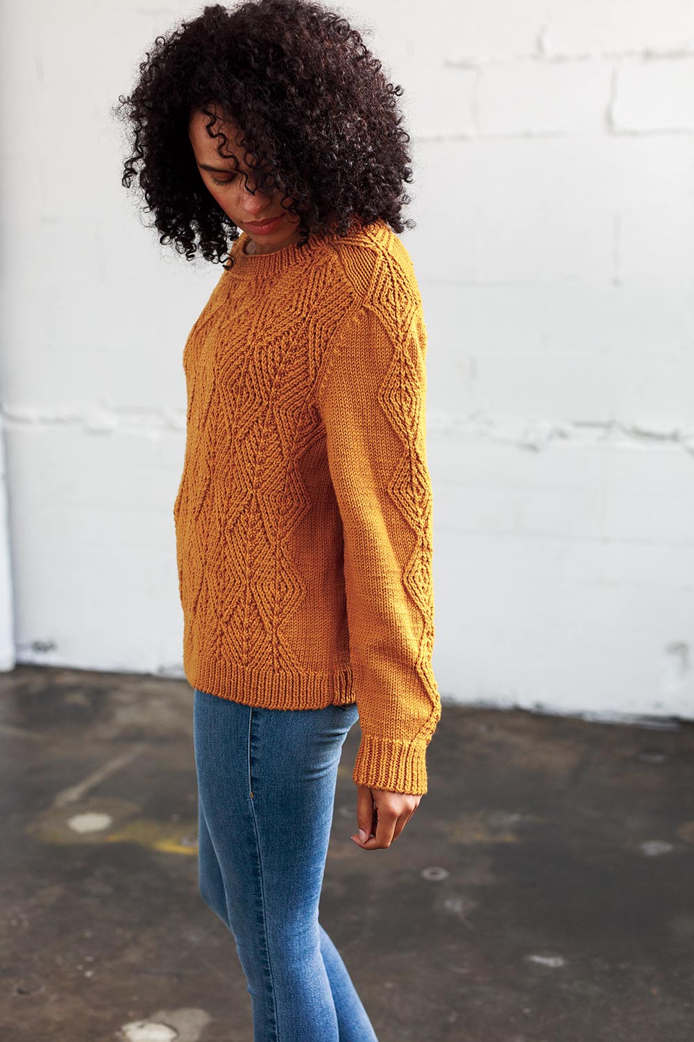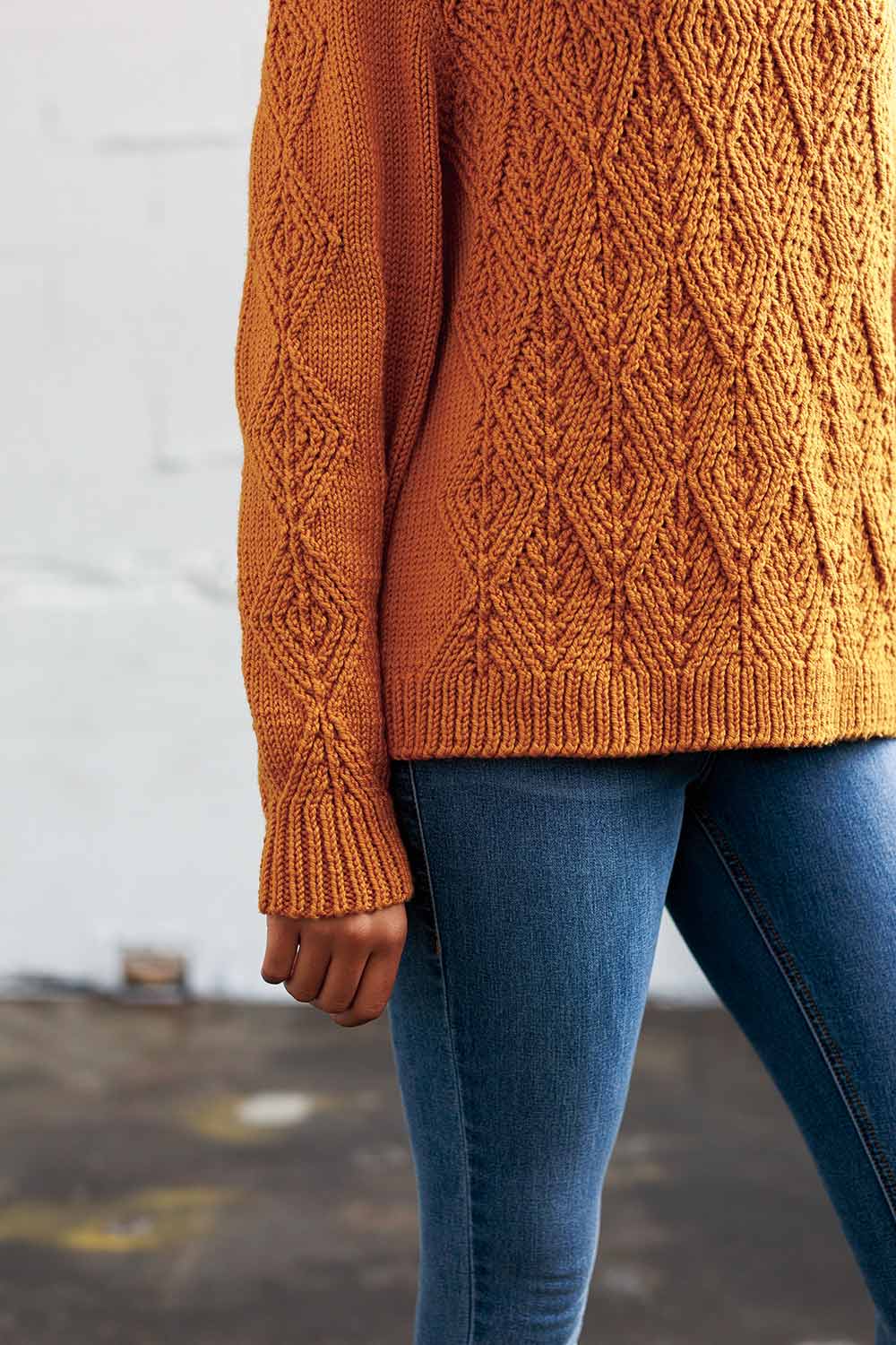 The pullover is worked bottom up in pieces, with an inclusive range of eleven sizes that takes into account the proportions of the twisted stitch diamond motif. Saddle shoulders ensure a perfect structure and flattering fit. Notes for simple modifications are included. Cable patterns are both written and charted.