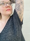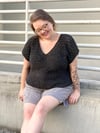 Top is worked flat in 2 pieces, bottom up, then seamed at shoulder and sides.