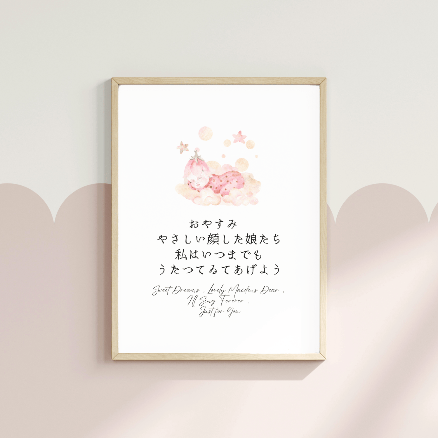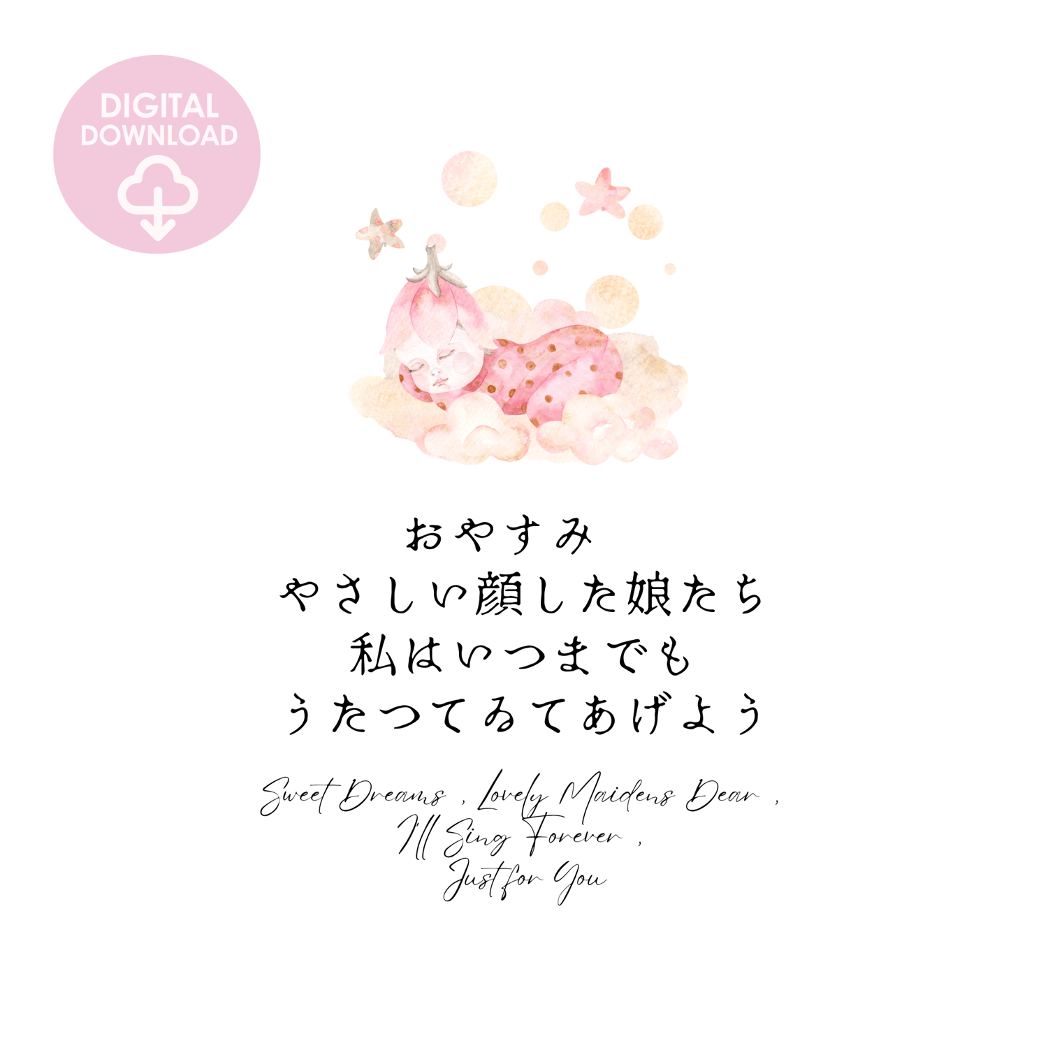 This printable wall art showcases a charming watercolor illustration of a sweetly sleeping baby girl, inspired by a poem from Japanese poet Tachihara Michizo. The artwork features a soothing lullaby quote in both English and Japanese, enhancing its cultural and emotional appeal. Designed to bring peace and beauty to your baby's nursery, this high-quality digital art is easy to download and print, providing a lovely addition to your home decor.