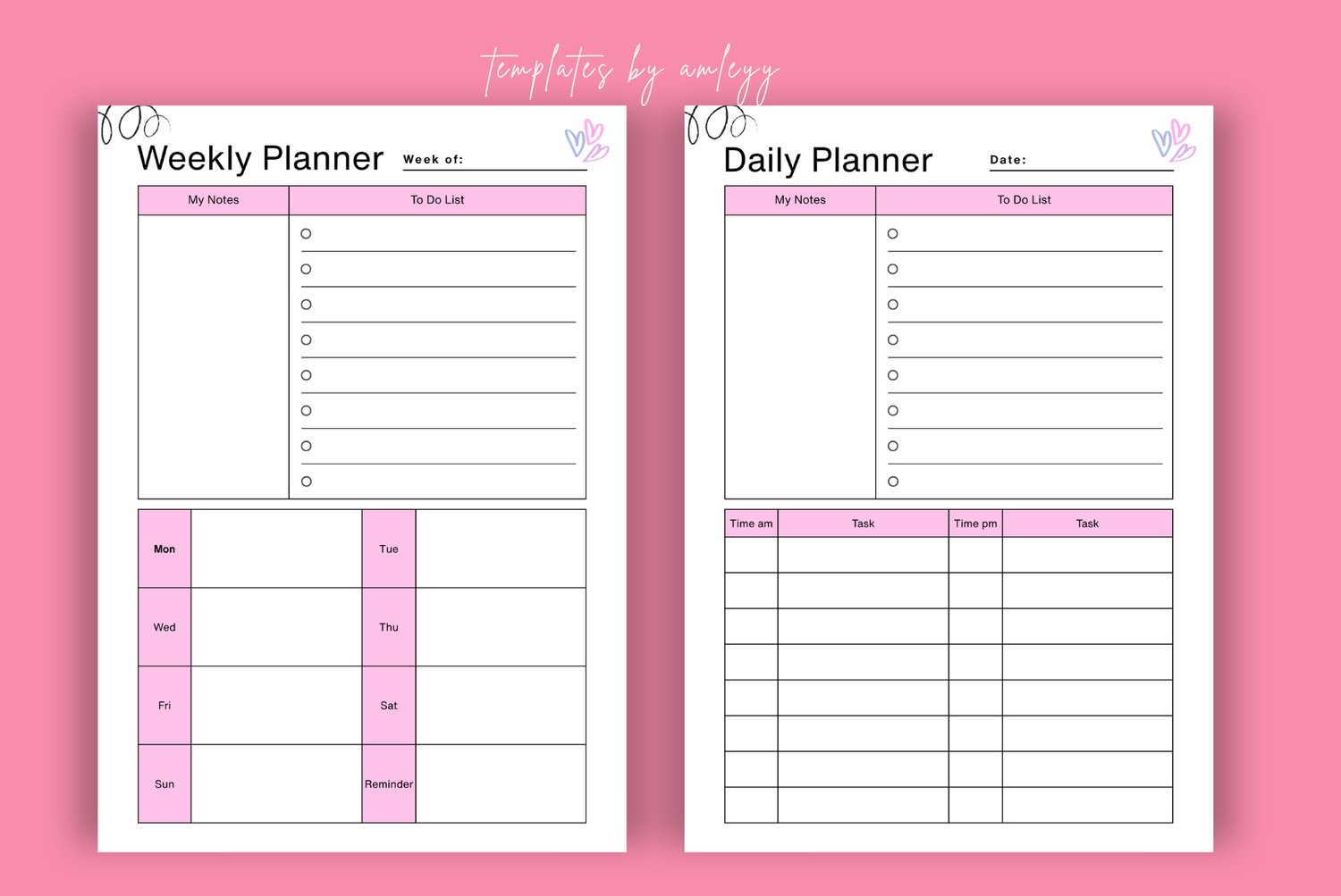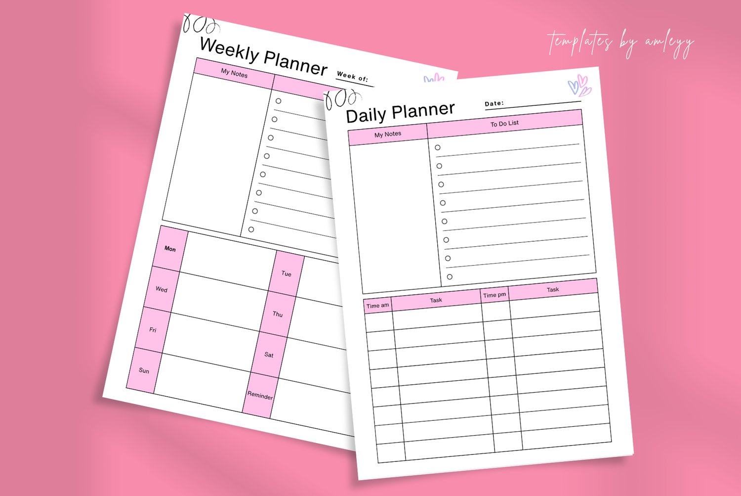 The Daily Planner includes sections for priorities, to-do lists, notes, and time blocking, while the Weekly Planner allows you to plan your week at a glance — perfect for scheduling tasks, meetings, and goals.