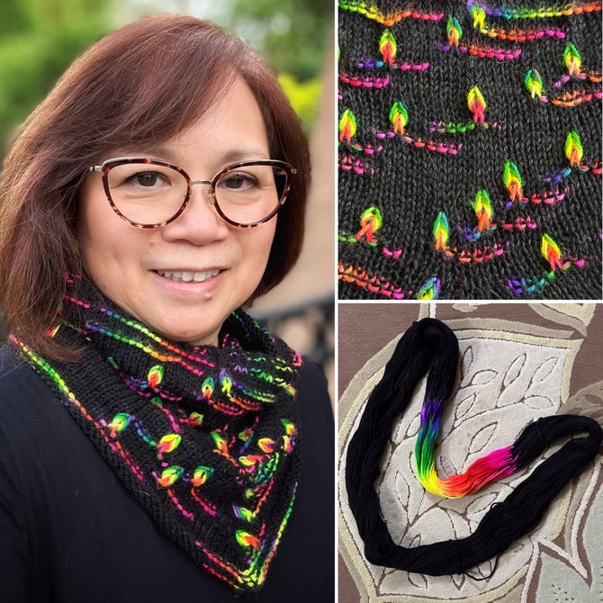 Knitting begins in the round at the neck with knit 2, purl 2 ribbing. Two kinds of assigned pooling make this cowl shine: the Flame Motif, and colorful purl bumps. Simple shaping at the center front creates cozy coverage over your shirt’s neckline. The cowl ends with a reverse stockinette edge to keep the bottom from curling up.