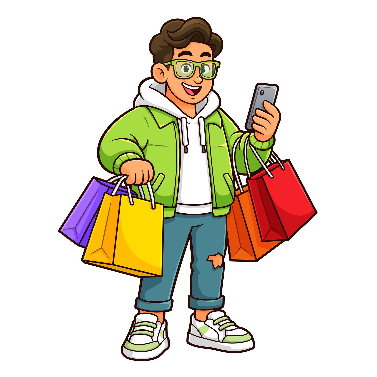 Cool Cartoon Shopper Character with Shopping Bags and Smartphone Illustration