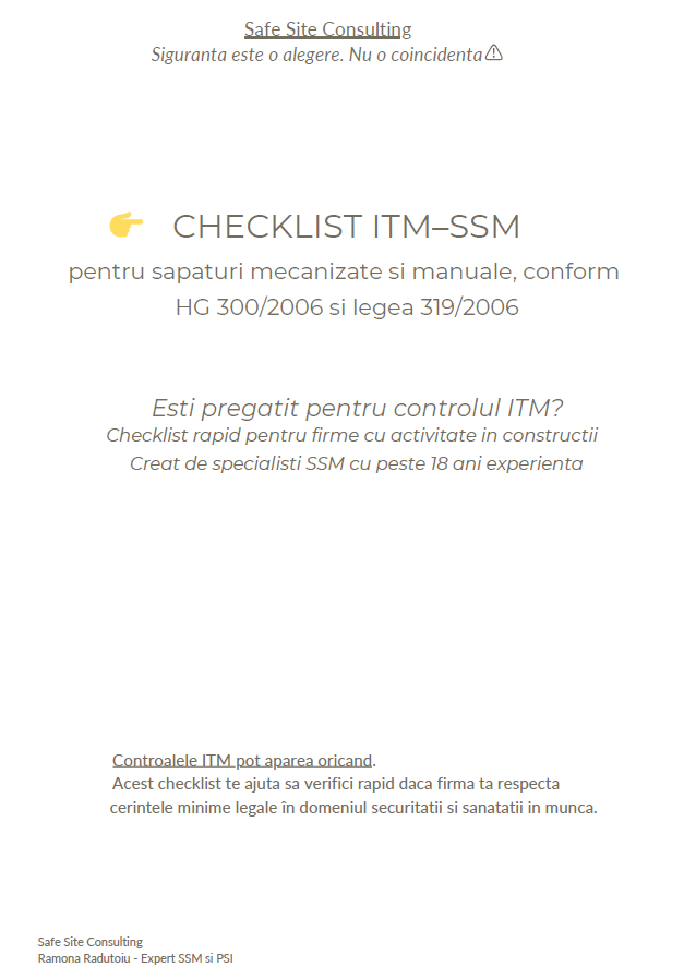 Creat pentru utilizare reală în teren, checklist-ul ajută managerii SSM, șefii de șantier și contractorii să identifice sistematic riscurile, să verifice măsurile de control și să mențină un nivel ridicat de siguranță pe tot parcursul etapelor de execuție.
