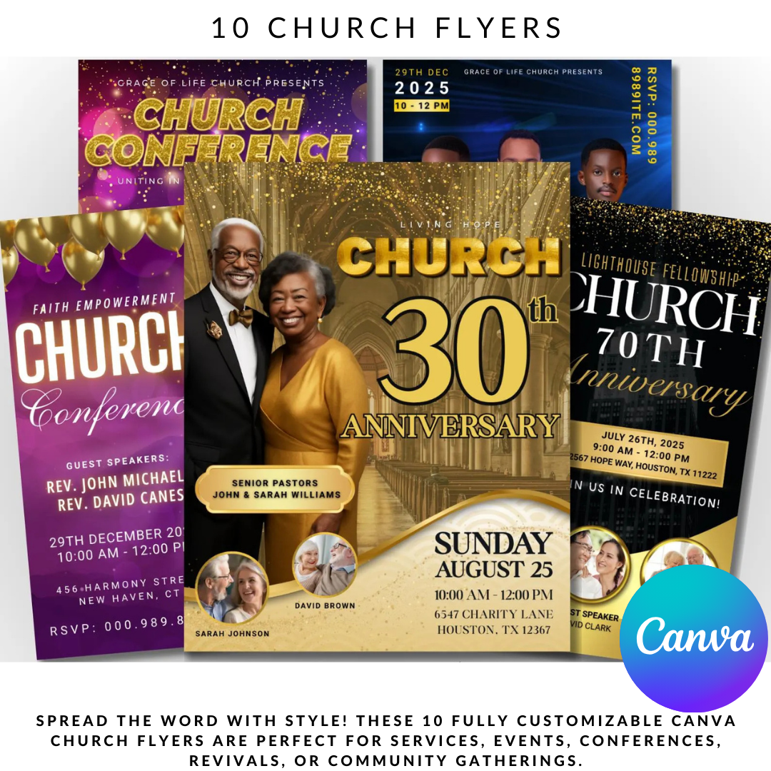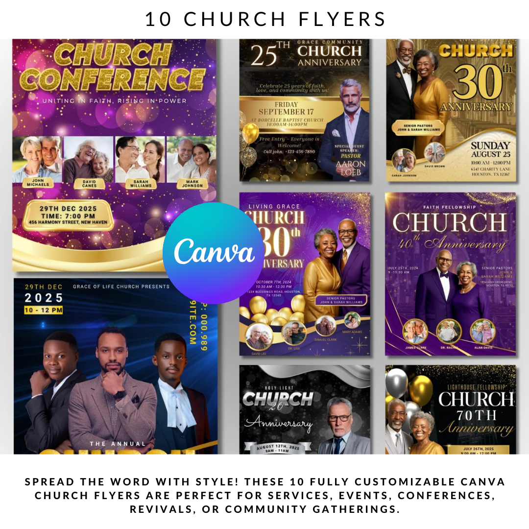 Spread the word with style! These 10 fully customizable Canva church flyers are perfect for services, events, conferences, revivals, or community gatherings. Designed to inspire and grab attention, each flyer can be tailored to match your ministry’s message and vibe.