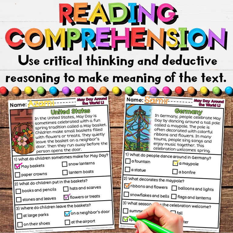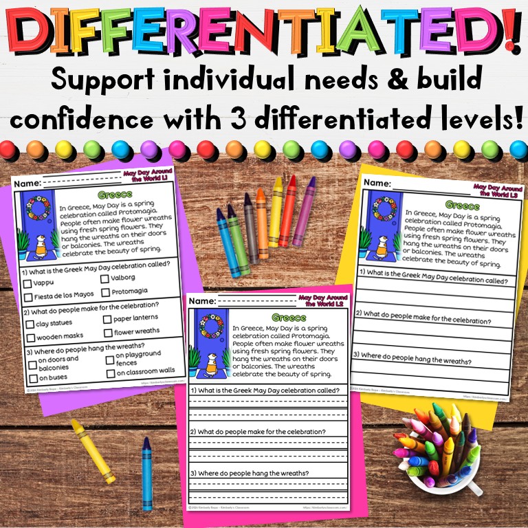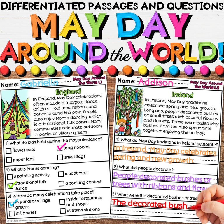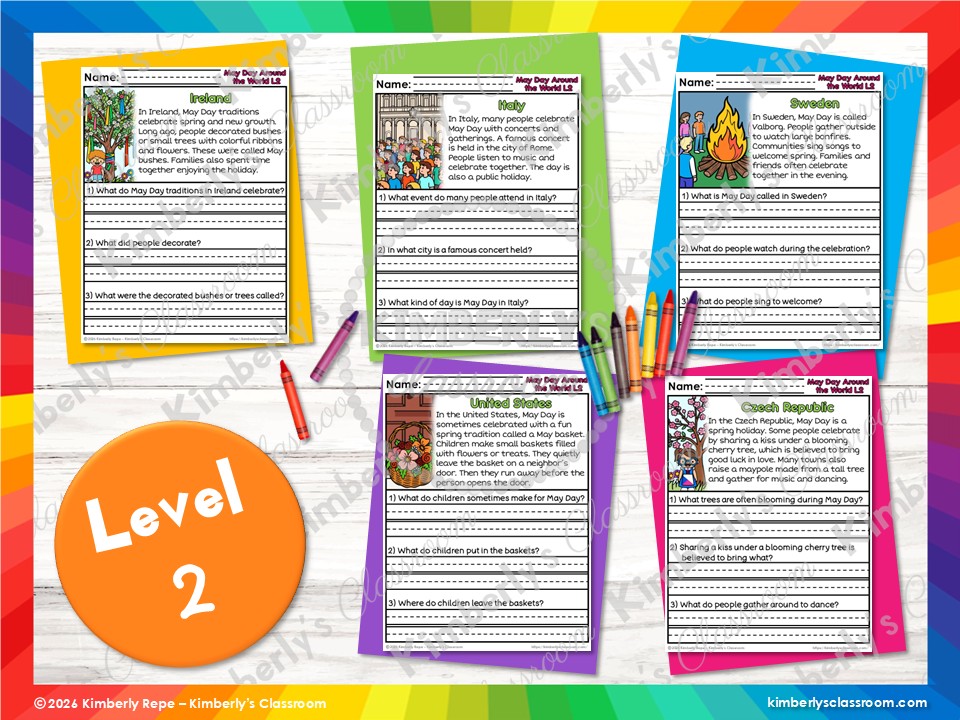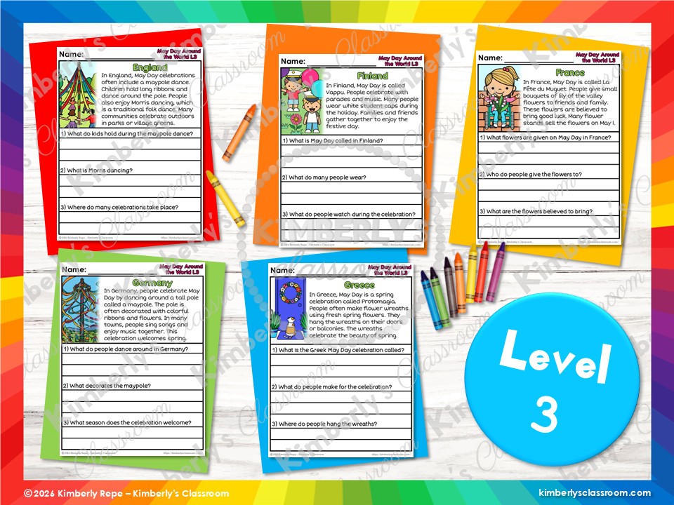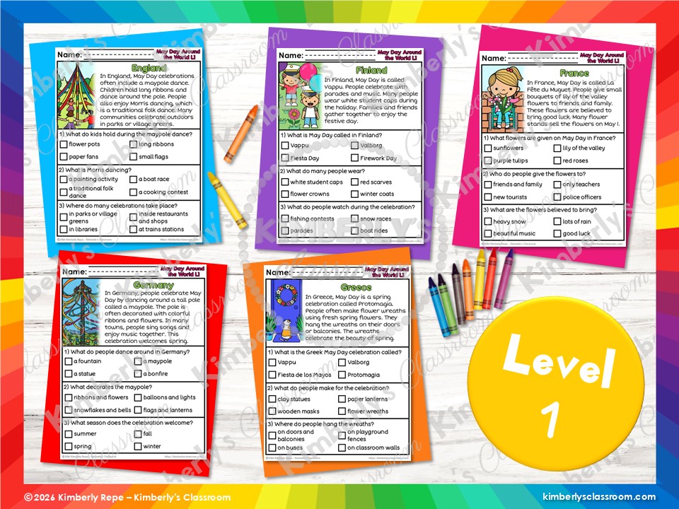 ❤️Your students will love learning how 10 countries celebrate May Day in unique ways, while practicing important fluency skills, reading comprehension skills and vocabulary with these differentiated social studies worksheets (30 pages + answer key + black & white set)!