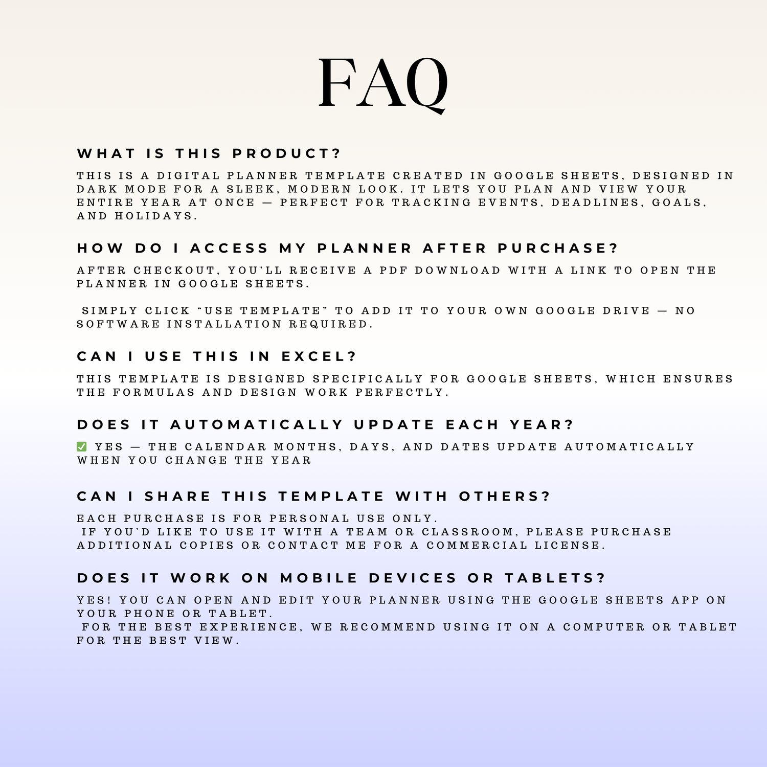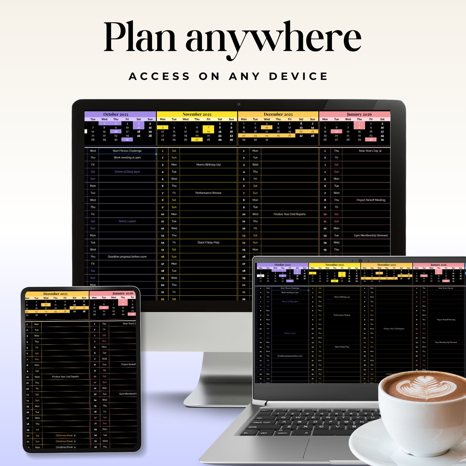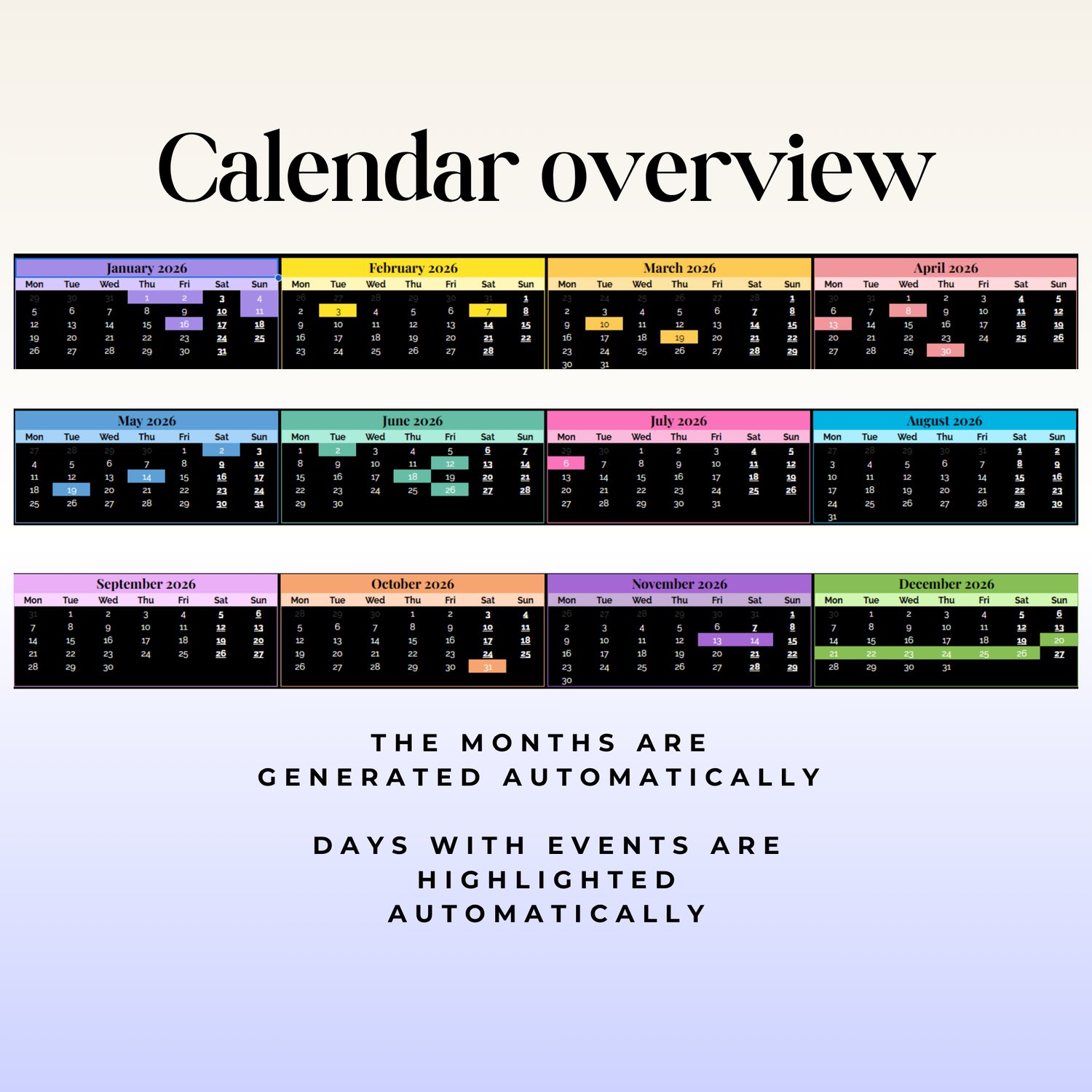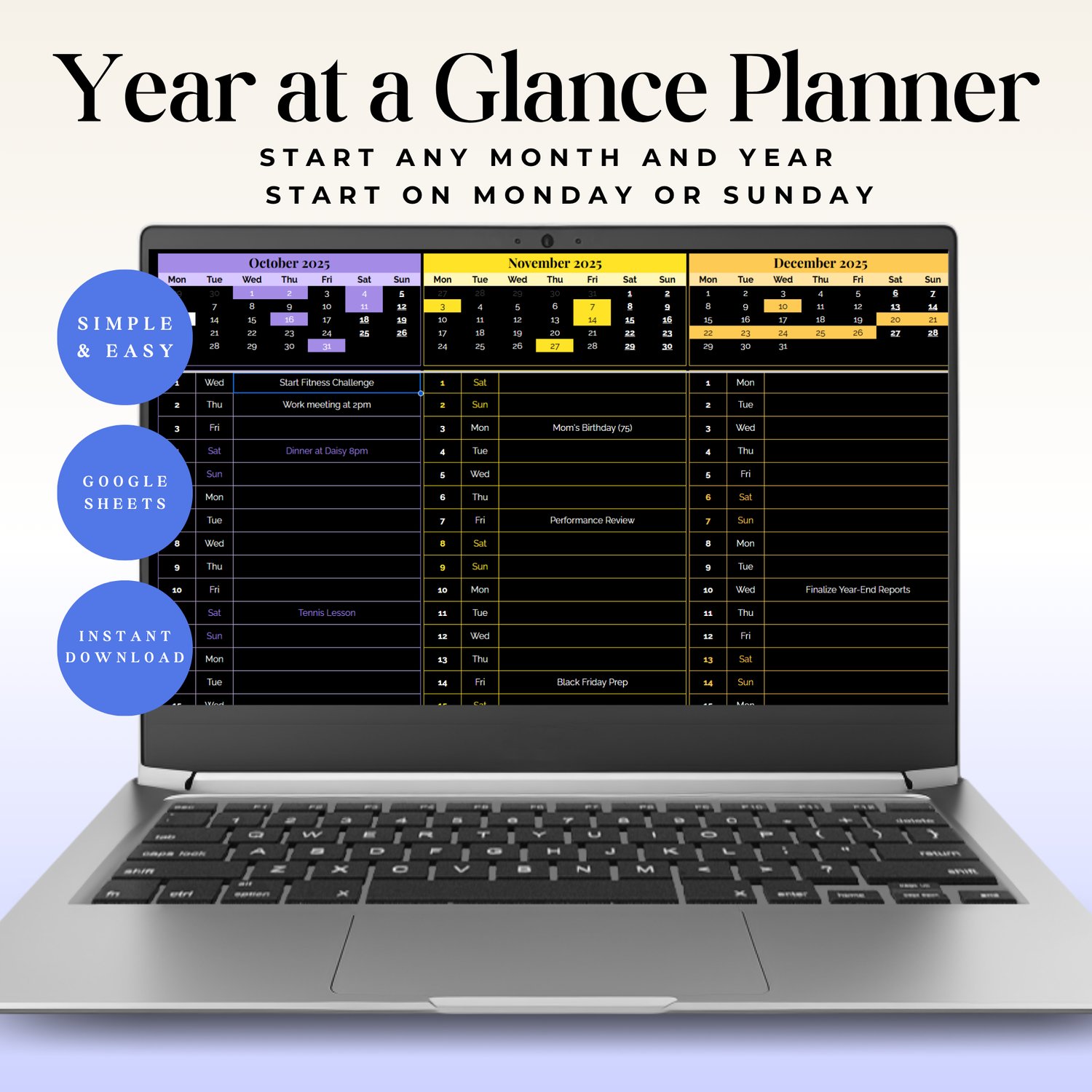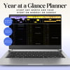 Stay organized in style with this modern dark-mode Year at a Glance digital planner. Start any month or year and choose the start day of the week (Sunday or Monday). No need to delete the information in the calendar anymore when you change month/year because the events/deadlines etc are dynamic too. Perfect for professionals, students, and anyone who loves sleek, minimalistic planning tools.