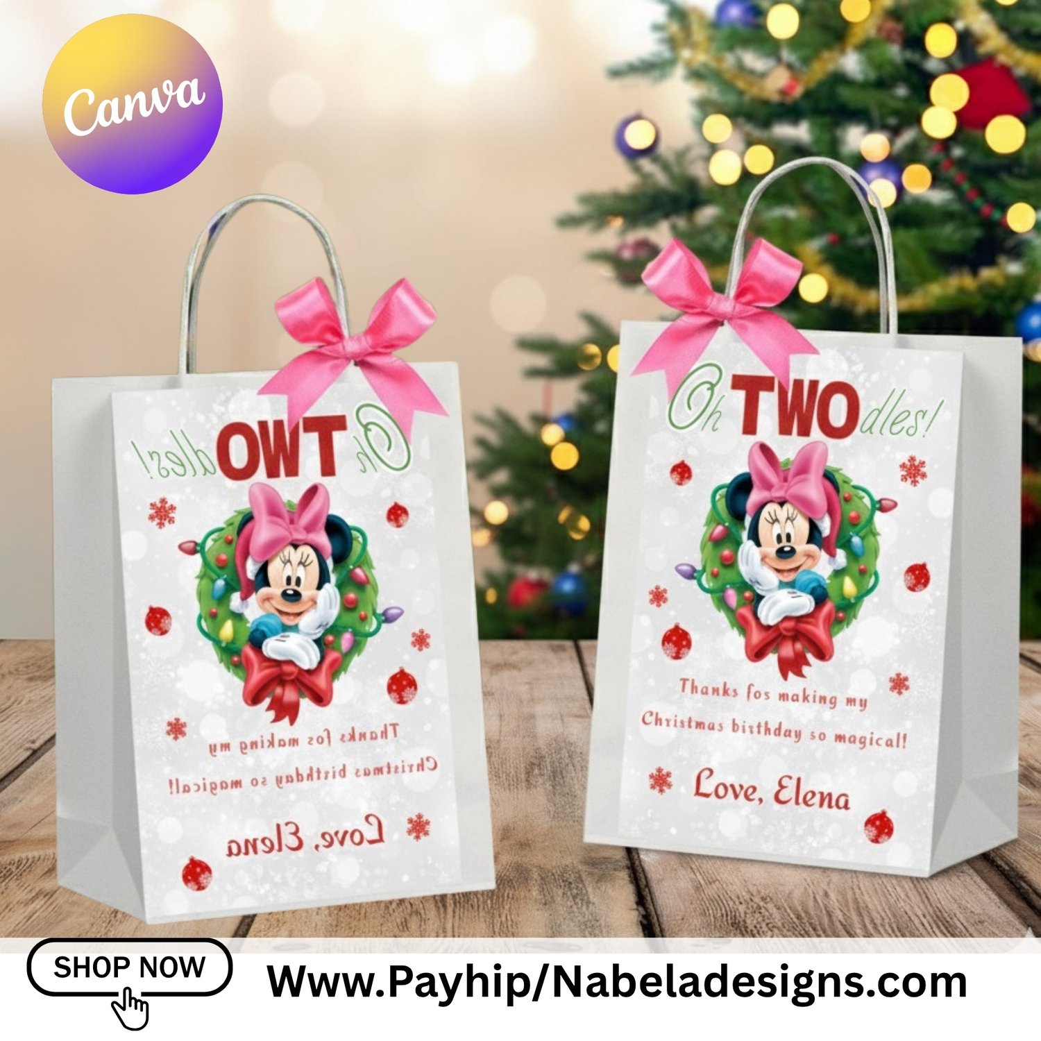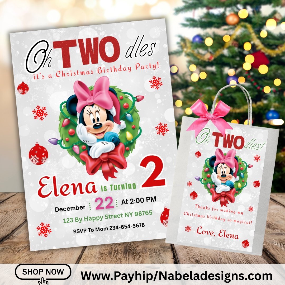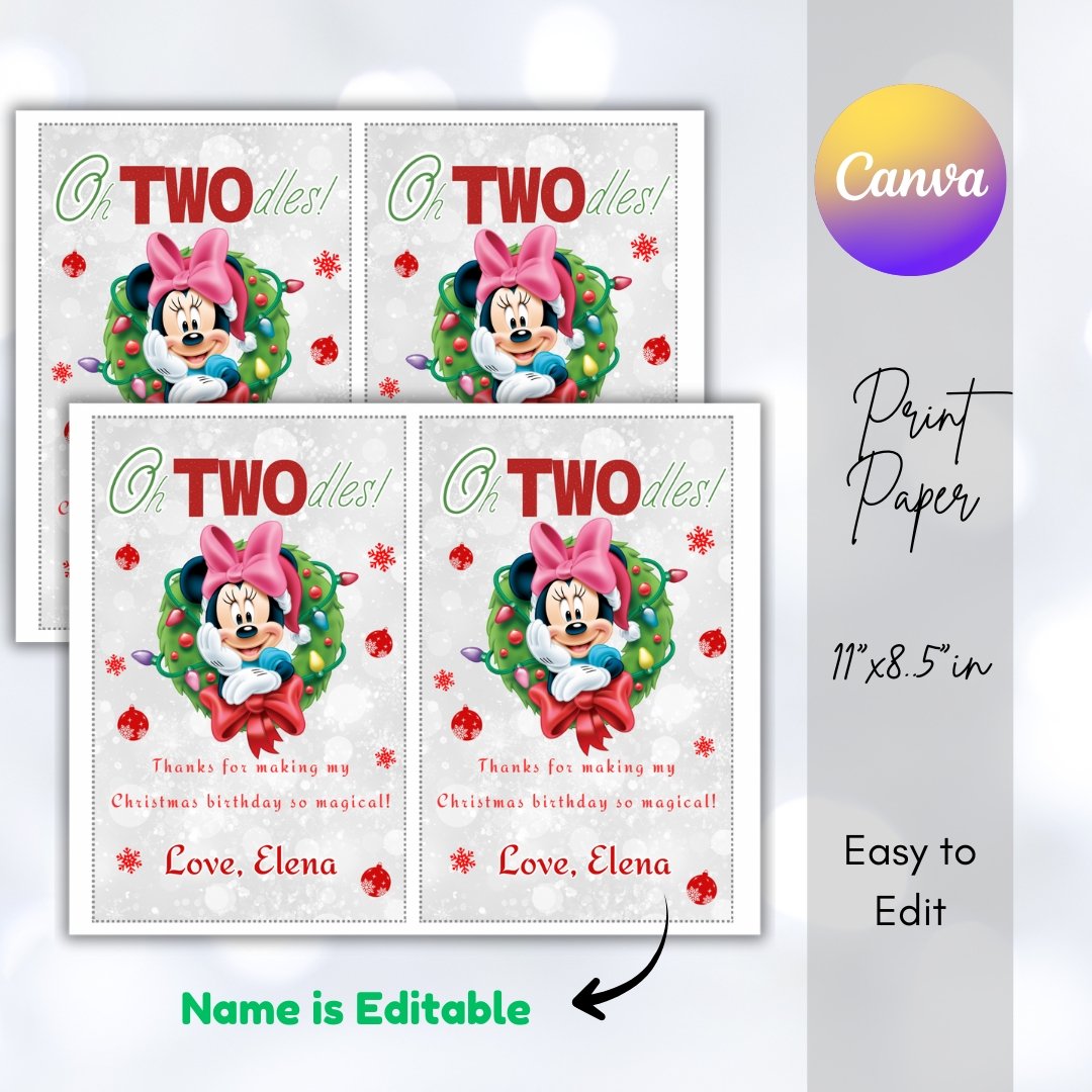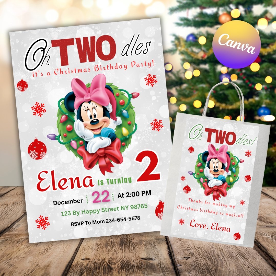 Celebrate your little one’s birthday with this adorable Minnie Mouse Christmas Birthday Invitation and Bag Label Set! Perfect for a festive holiday party, this editable Canva template features Minnie in a cute Christmas theme — ideal for adding a touch of Disney magic to your celebration.