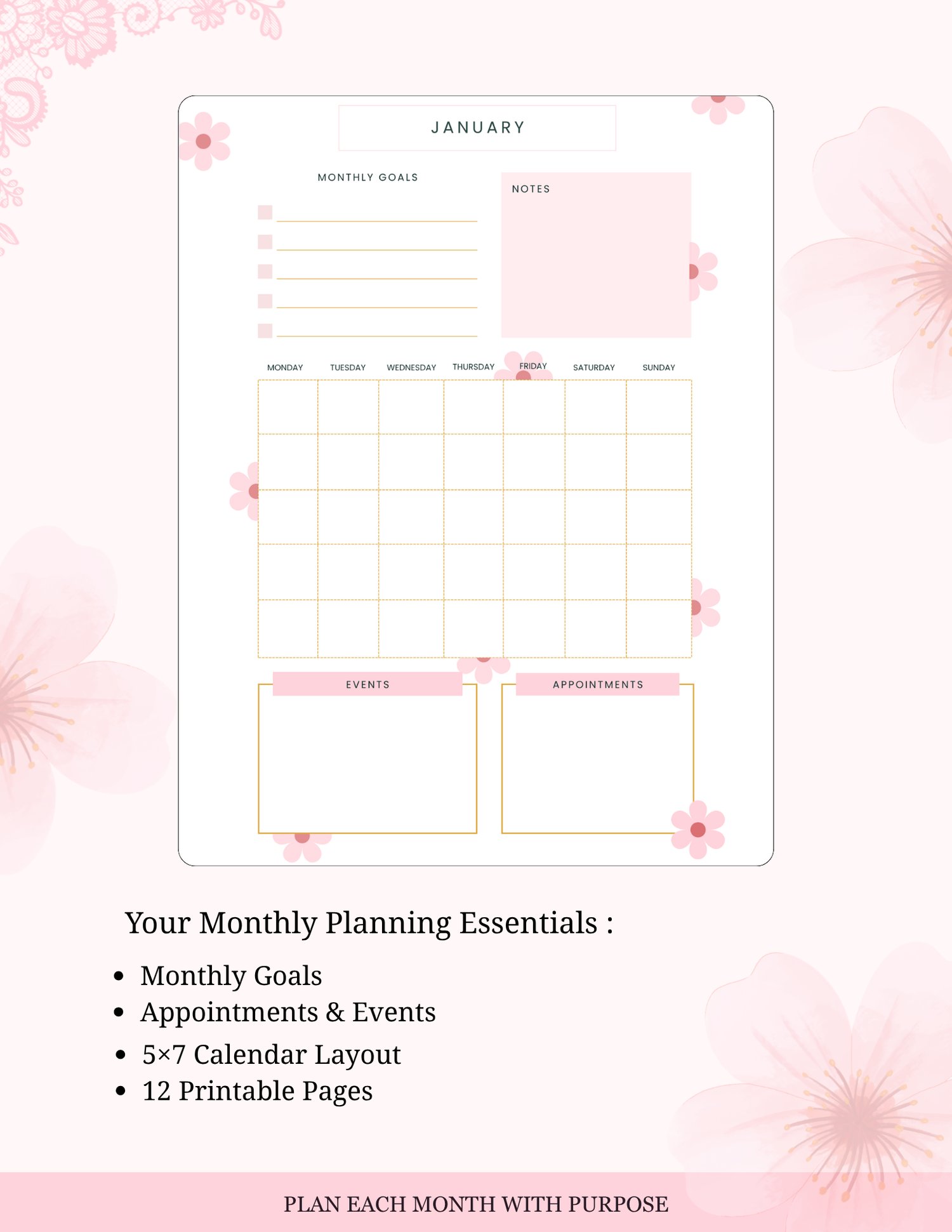 Each month includes dedicated sections for your goals, events, appointments, and notes, plus a 5-week calendar layout to plan everything in one place.