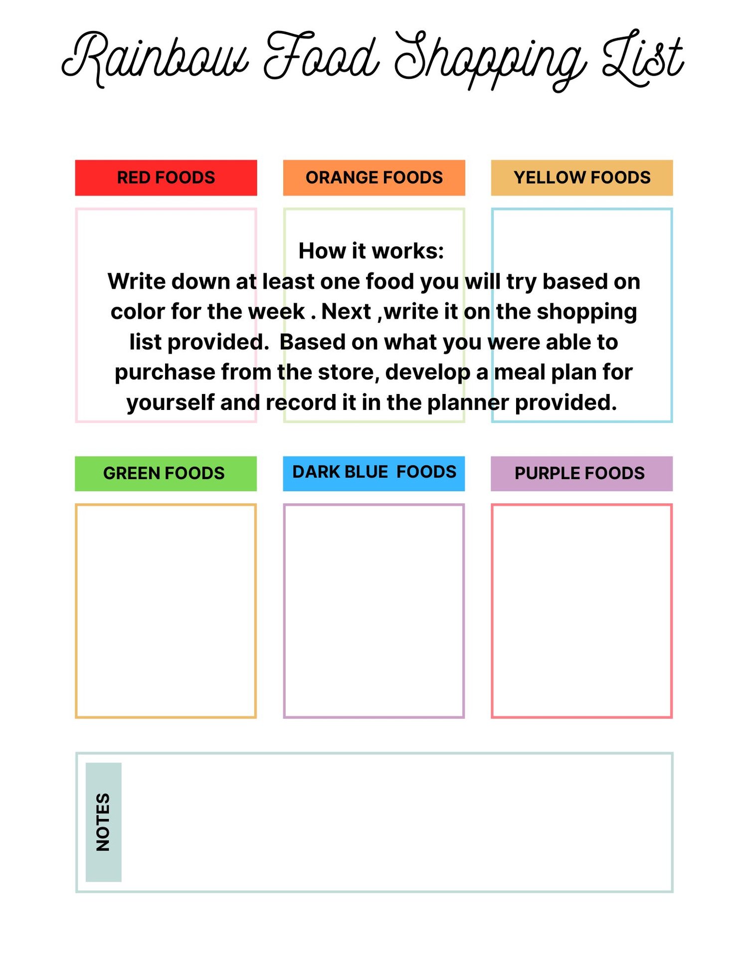 Write down at least one food you will try based on color for the week . Next, write it on the shopping list provided. Based on what you were able to purchase from the store, develop a meal plan for yourself and record it in the planner provided.