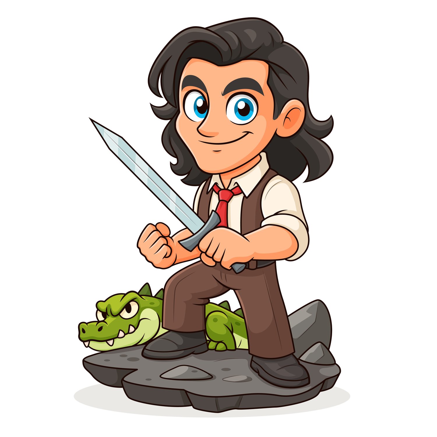 cartoon hero man with sword standing rock vector style illustration
