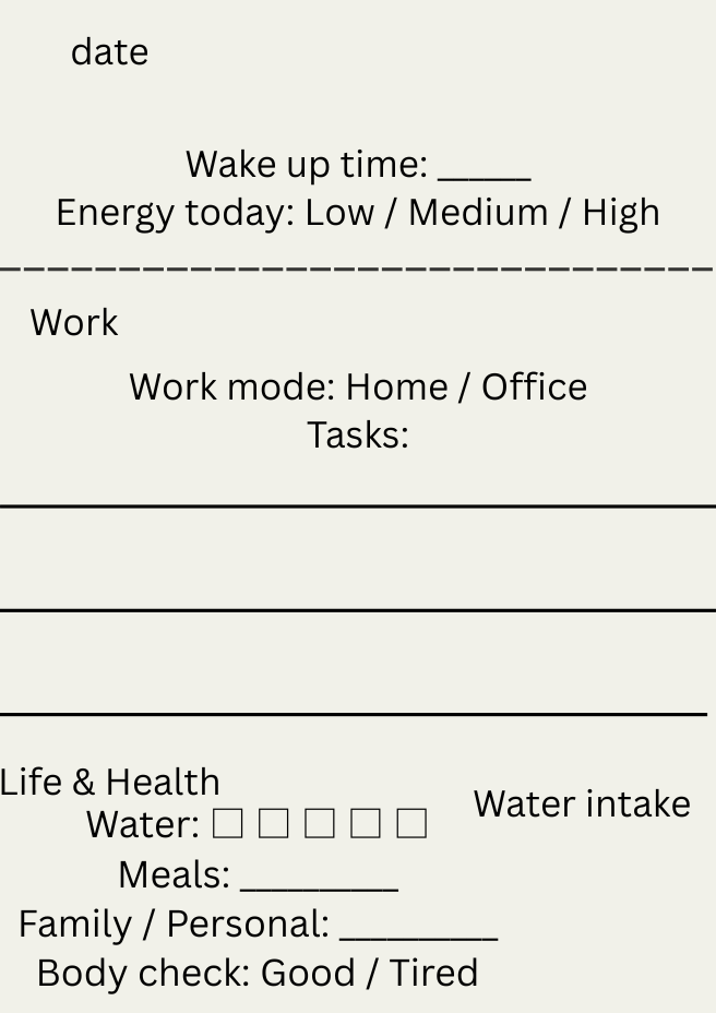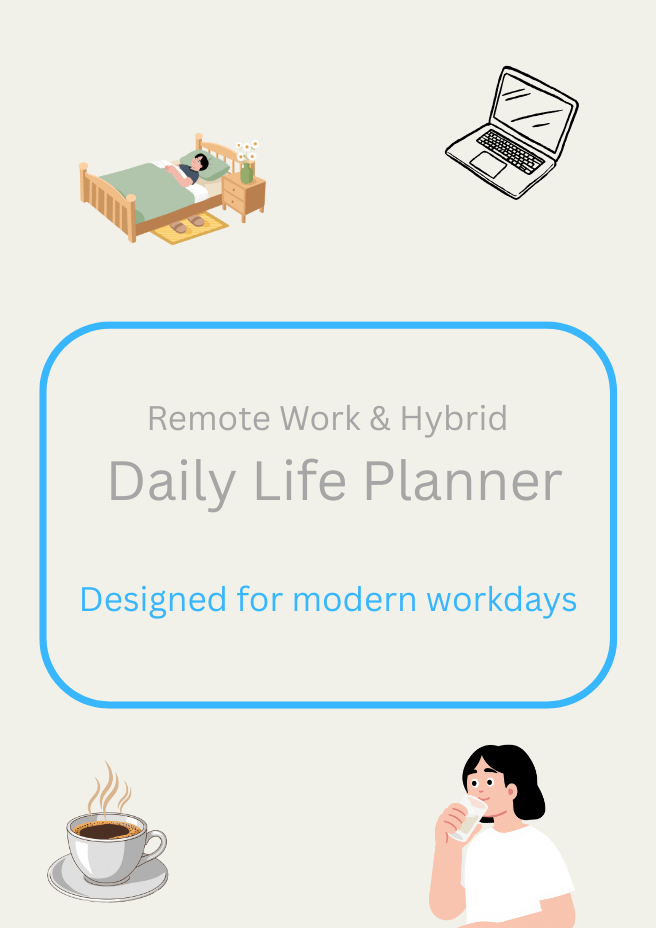 A smart daily planner designed for modern work lifestyles — remote and hybrid. This planner helps you stay productive while maintaining balance between work, health, and personal life.