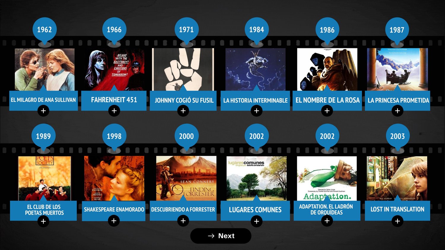 ¡Espero que os sea de mucha utilidad tener una cronología digital interactiva con las reseñas y tráilers de algunas de las películas que he considerado más relevantes en relación con el lenguaje, la comunicación humana, la importancia de los libros y la lectura, de la escritura y el proceso de creación.