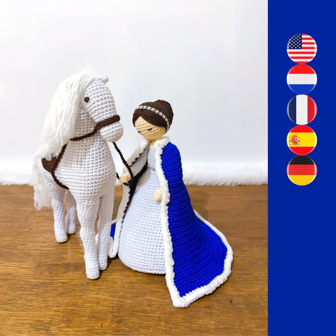 The duchess is 24cm/9.4inch tall. The horse is 26cm/10.2inch tall. Both are made with “FINGERING” weight yarn suitable for amigurumi and a size 2mm crochet hook.