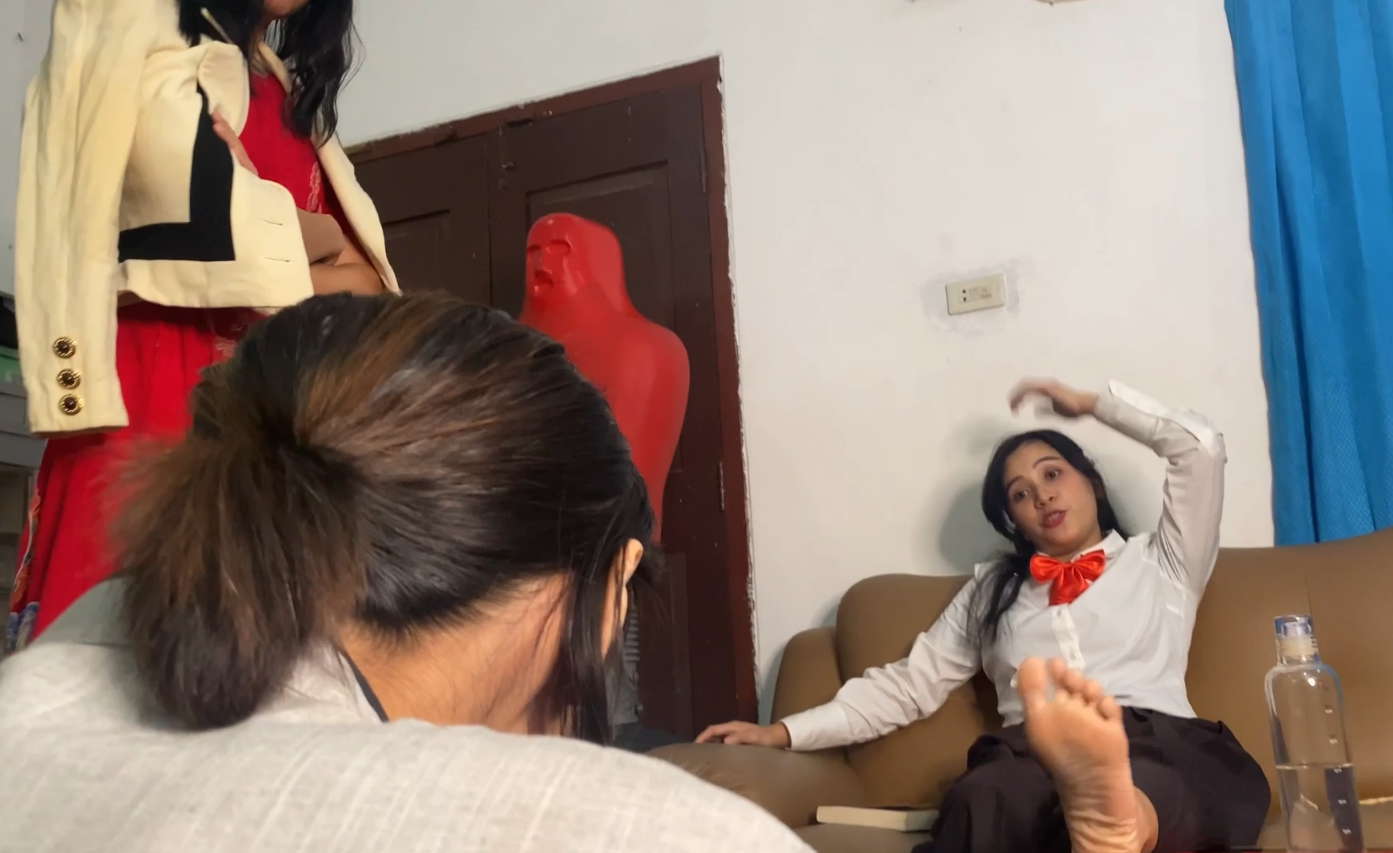 After her mum leaves, Chintya will then dominate this slave with slaps, kicks and feet