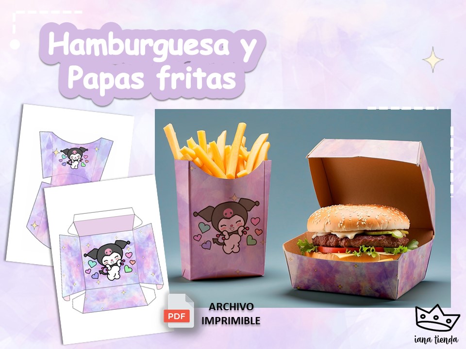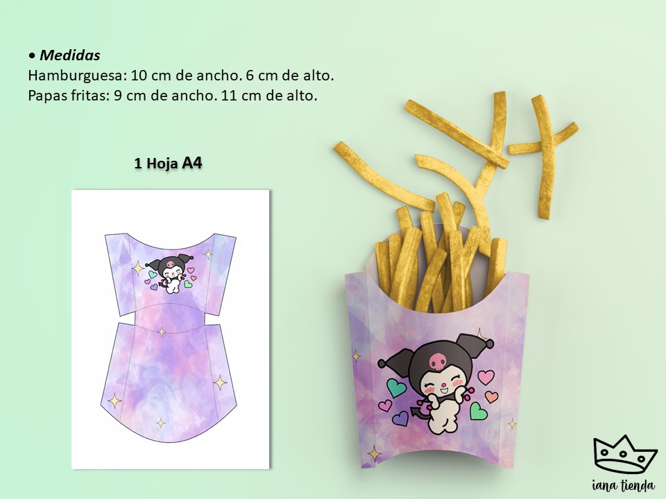 Esta plantilla incluye un adorable diseño de Kuromi, ideal para armar una cajita temática de hamburguesa y papas fritas. Perfecta para fiestas, celebraciones infantiles o para darle un toque especial y divertido a tus comidas.