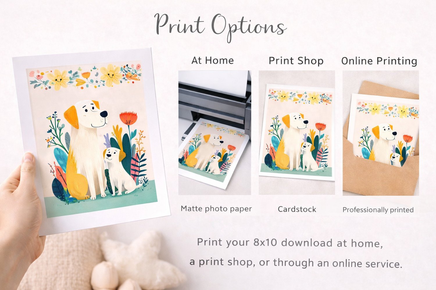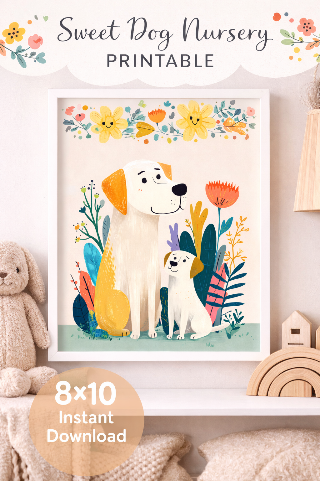 This sweet printable nursery wall art features a gentle mother dog sitting beside her little puppy, surrounded by cheerful flowers and soft garden details. The friendly expressions and warm illustration style create a calm, comforting scene that’s perfect for a cozy nursery or baby room.