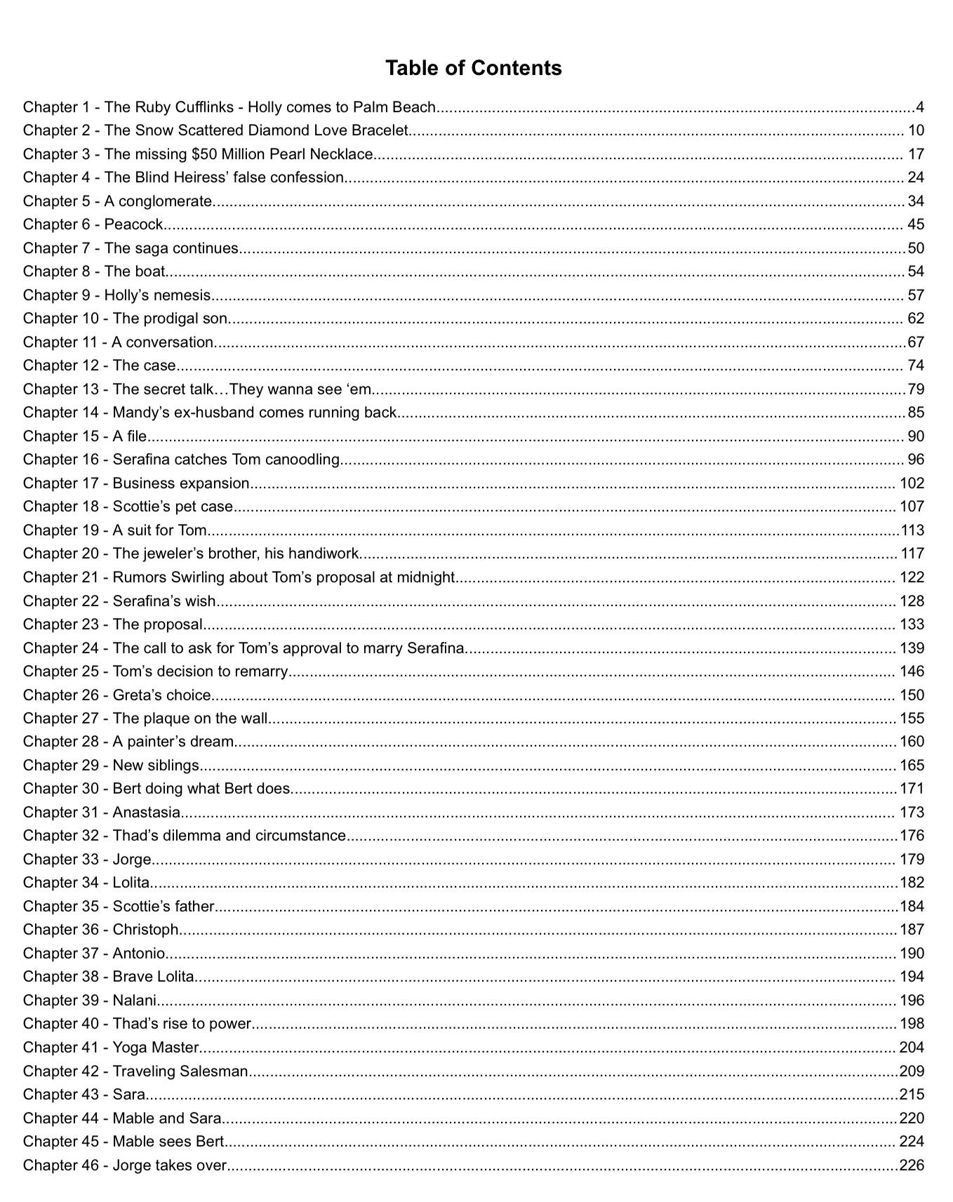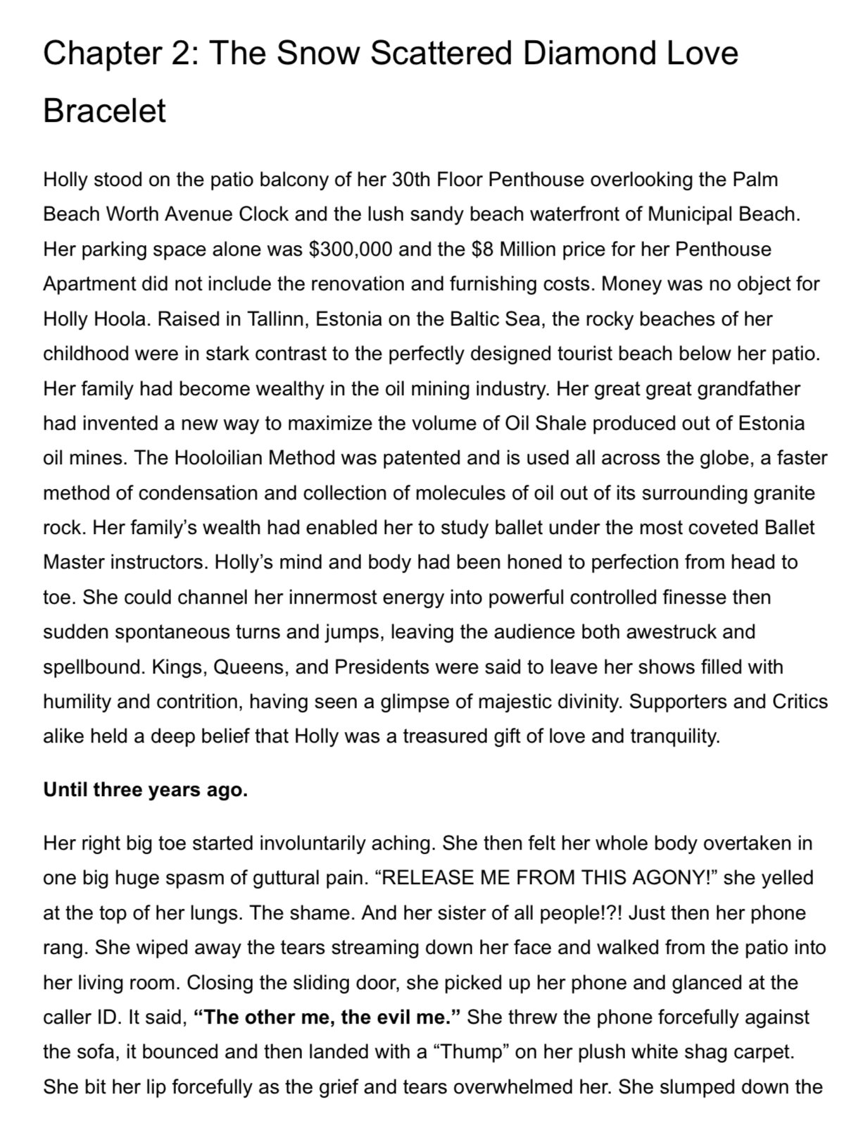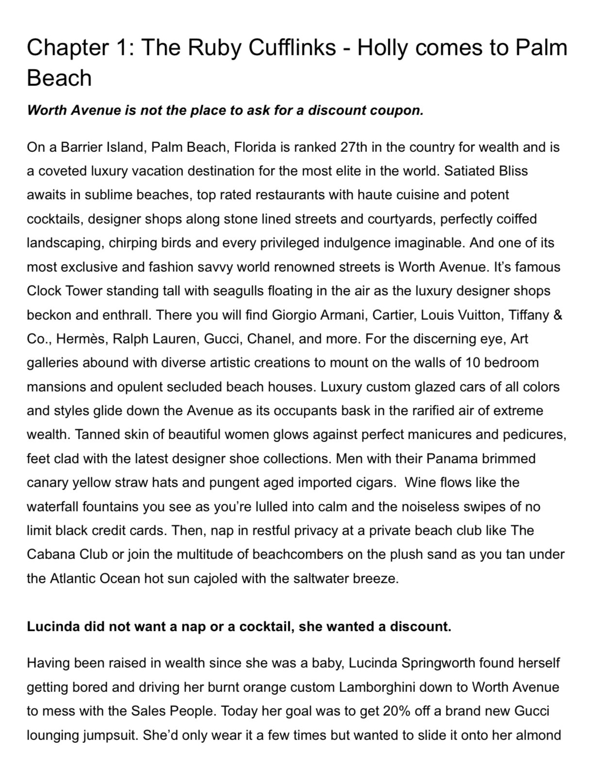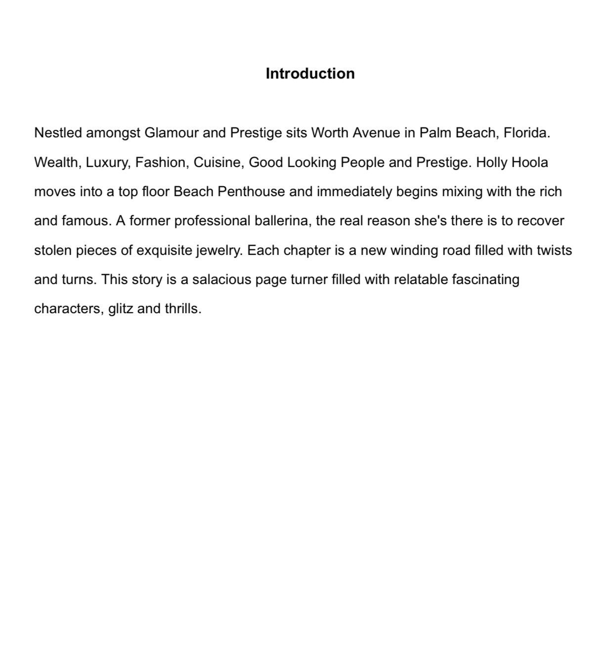 Free Audio Preview! (Book and 2 Chapters of Audio plus excerpt of Chapter 19 “The Suit”). Book #1 of a Series. Nestled amongst Glamour and Prestige sits Worth Avenue in Palm Beach, Florida. Wealth, Luxury, Fashion, Cuisine, Good Looking People and Prestige. Holly Hoola moves into a top floor Beach Penthouse and immediately begins mixing with the rich and famous. A former professional ballerina, the real reason she's there is to recover stolen pieces of exquisite jewelry. Each chapter is a new winding road to find the thief and recover the jewels. This story is a salacious page turner filled with relatable fascinating characters, glitz and thrills.