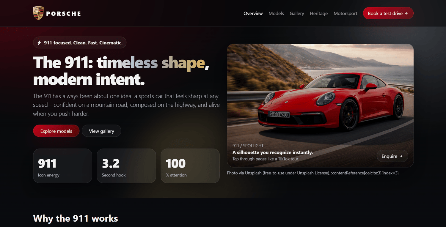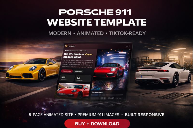A high-end, 911-focused website template built for creators, car enthusiasts, and automotive brands who want a cinematic, modern Porsche-style site without frameworks or setup headaches.