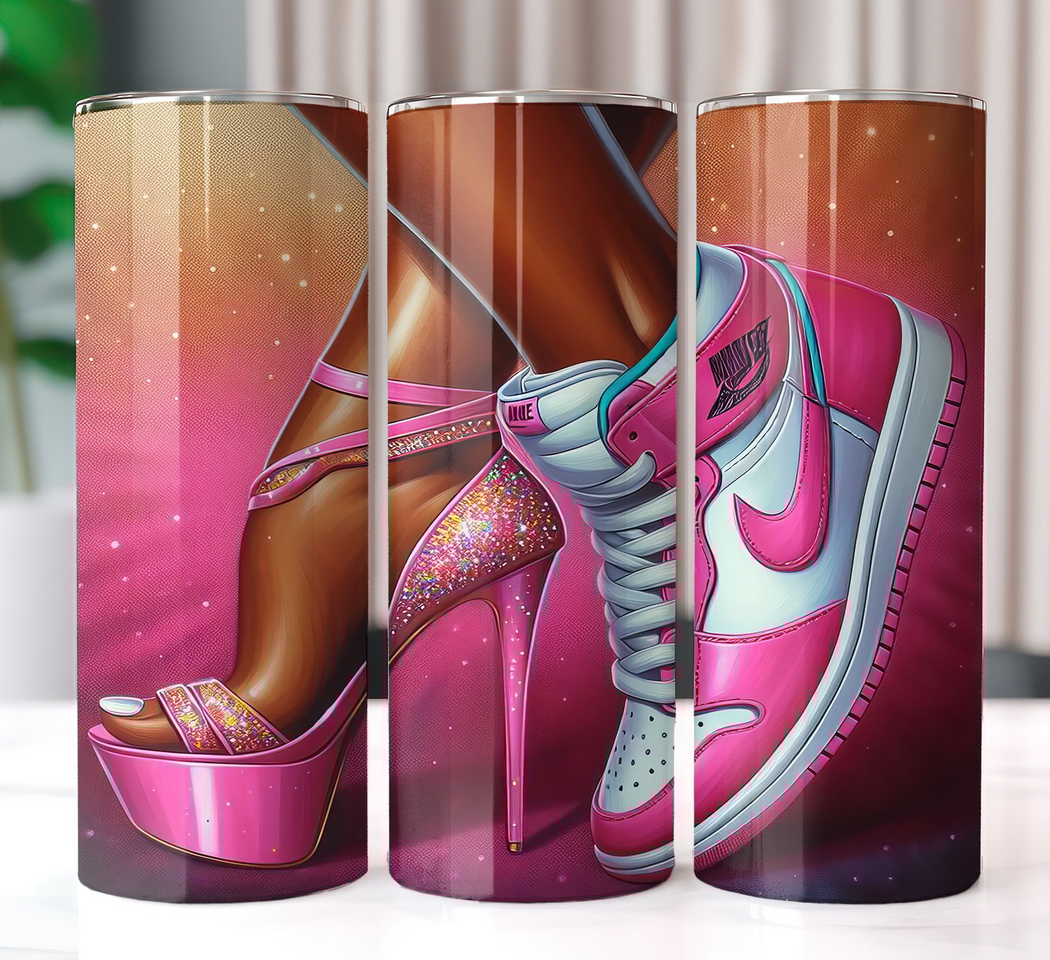 This bold and glamorous tumbler design features a sparkling glitter stiletto on one side and a hot pink sneaker on the other—perfect for the fashion-forward babe who rocks every step.