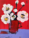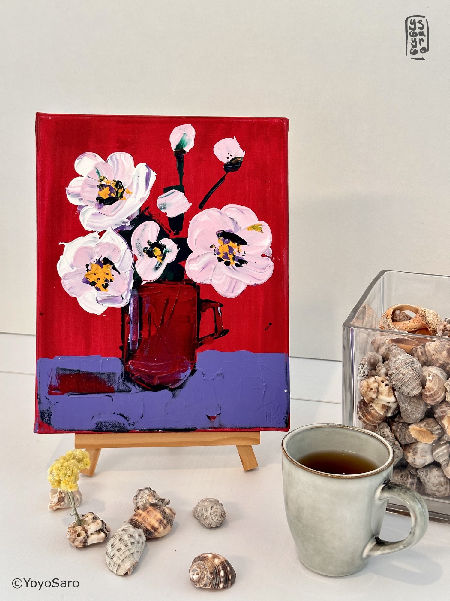Esta obra capta la frescura de un ramo de flores con una técnica expresiva y texturizada en acrílico sobre lienzo. Con unas medidas de 20x25 cm, destaca por su vibrante fondo rojo, la base violeta y la fuerza de las pinceladas en las flores blancas con toques amarillos.