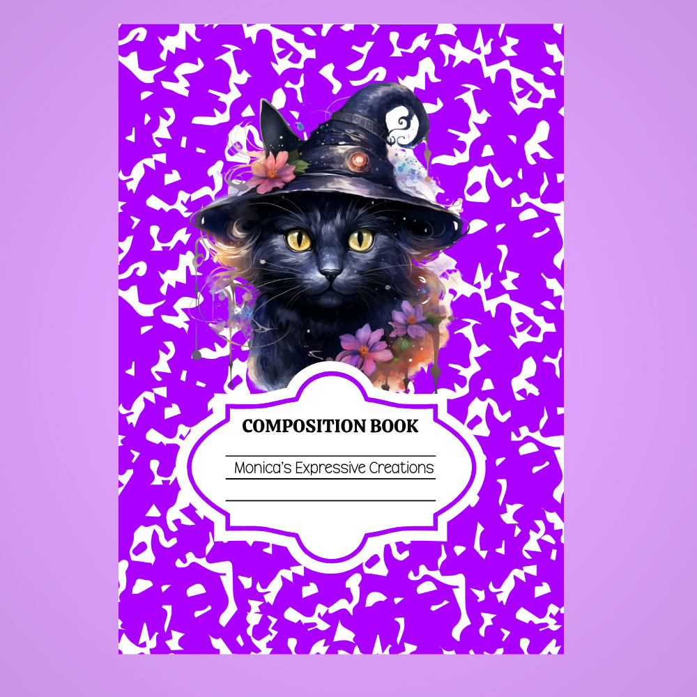 Add a magical touch to your school supplies or journaling routine with this adorable purple composition notebook cover featuring a black cat! This printable digital download includes both a front and back cover. The front showcases a stylish black cat against a vibrant purple background, while the back cover features a coordinating purple and white design.