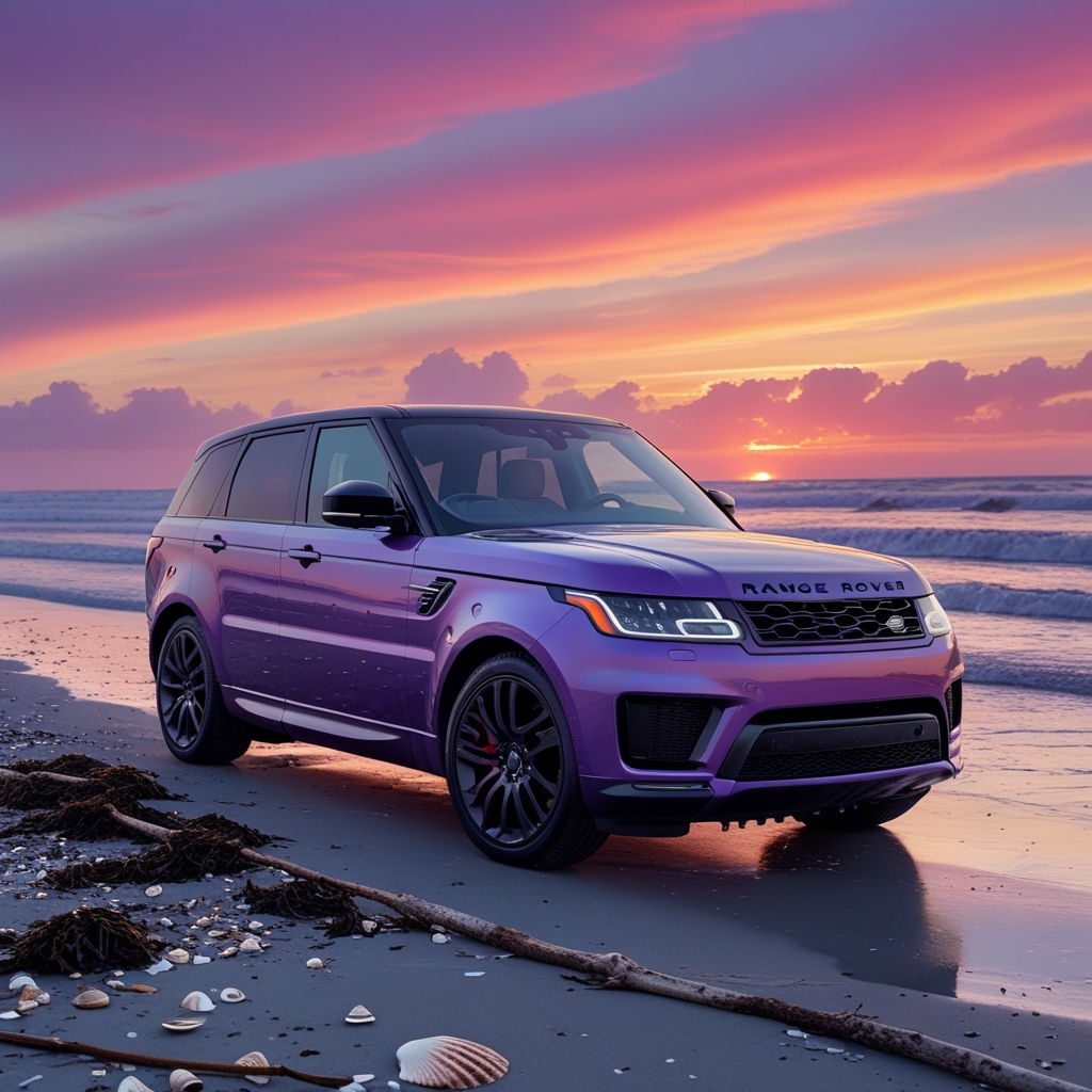 A stunning metallic violet Range Rover Sport parked on a serene beach at low tide, with gentle waves lapping at the shore, as a breathtaking sunset unfolds in the background, casting a warm orange-gold light across the scene. The luxurious SUV's sleek, angular lines and gleaming violet finish appear radiant against the vibrant hues of the sky, where soft pink and purple clouds are streaked across the horizon. The beach itself is lined with scattered shells and seaweed, with a few driftwood sticks strewn about, creating a sense of rustic serenity. In the distance, the sun dips below the horizon, leaving a trail of fiery colors that reflect off the Range Rover's metallic surface, creating an eye-catching contrast between the man-made beauty and the natural wonder of the setting.