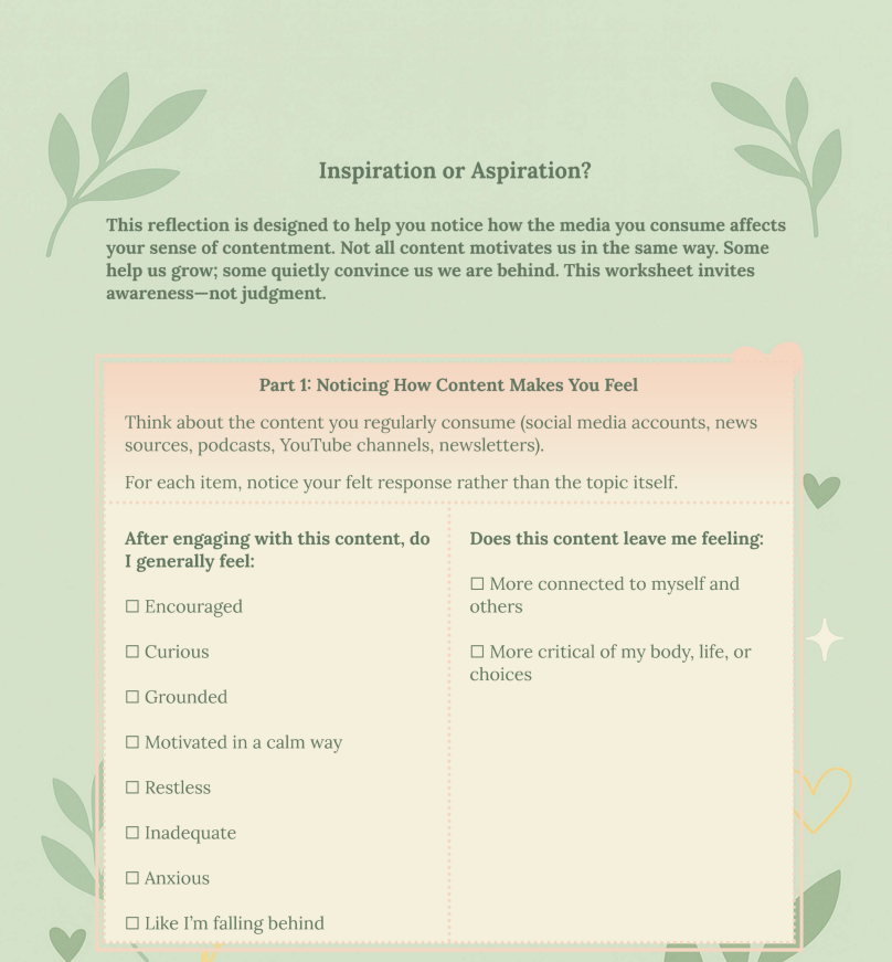Inspiration or Aspiration? is a thoughtfully designed, 6-page guided reflection that helps you notice how the content you consume affects your sense of contentment, alignment, and emotional well-being—without judgment or pressure to “fix” anything.