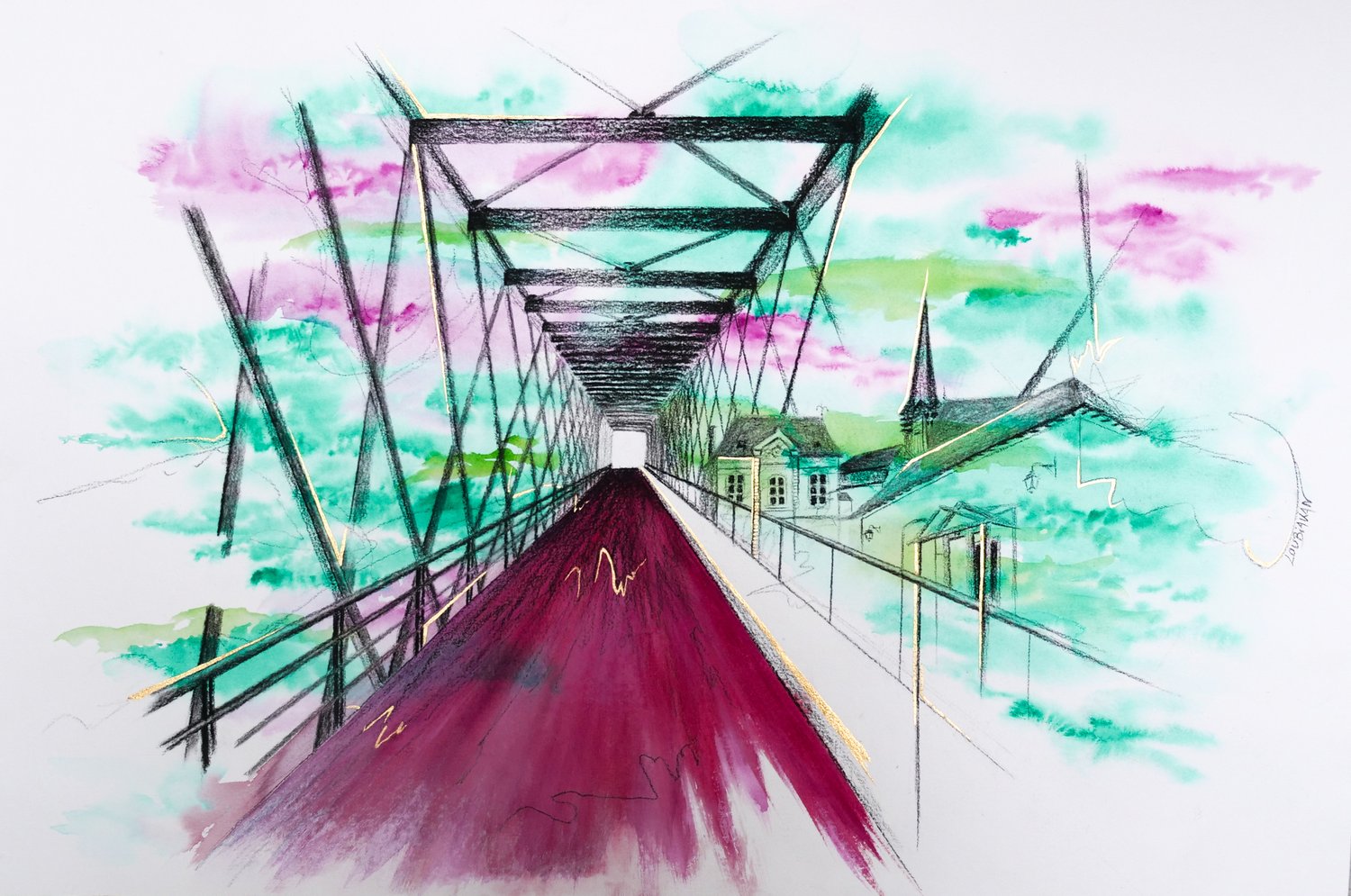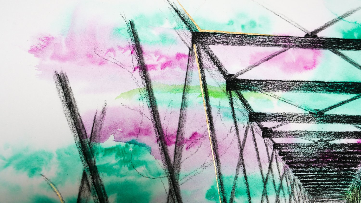Fusain, aquarelle et mélange doré sur papier