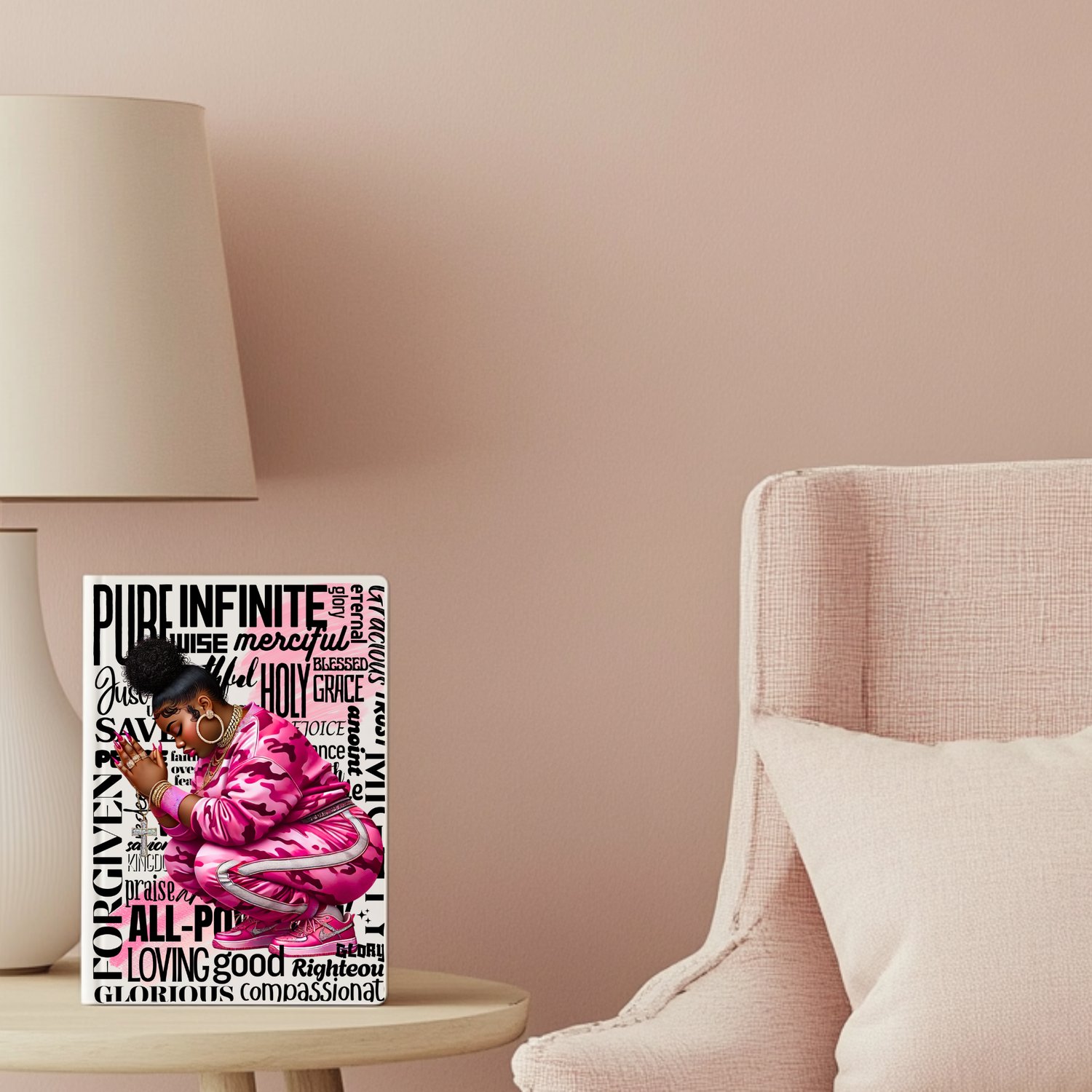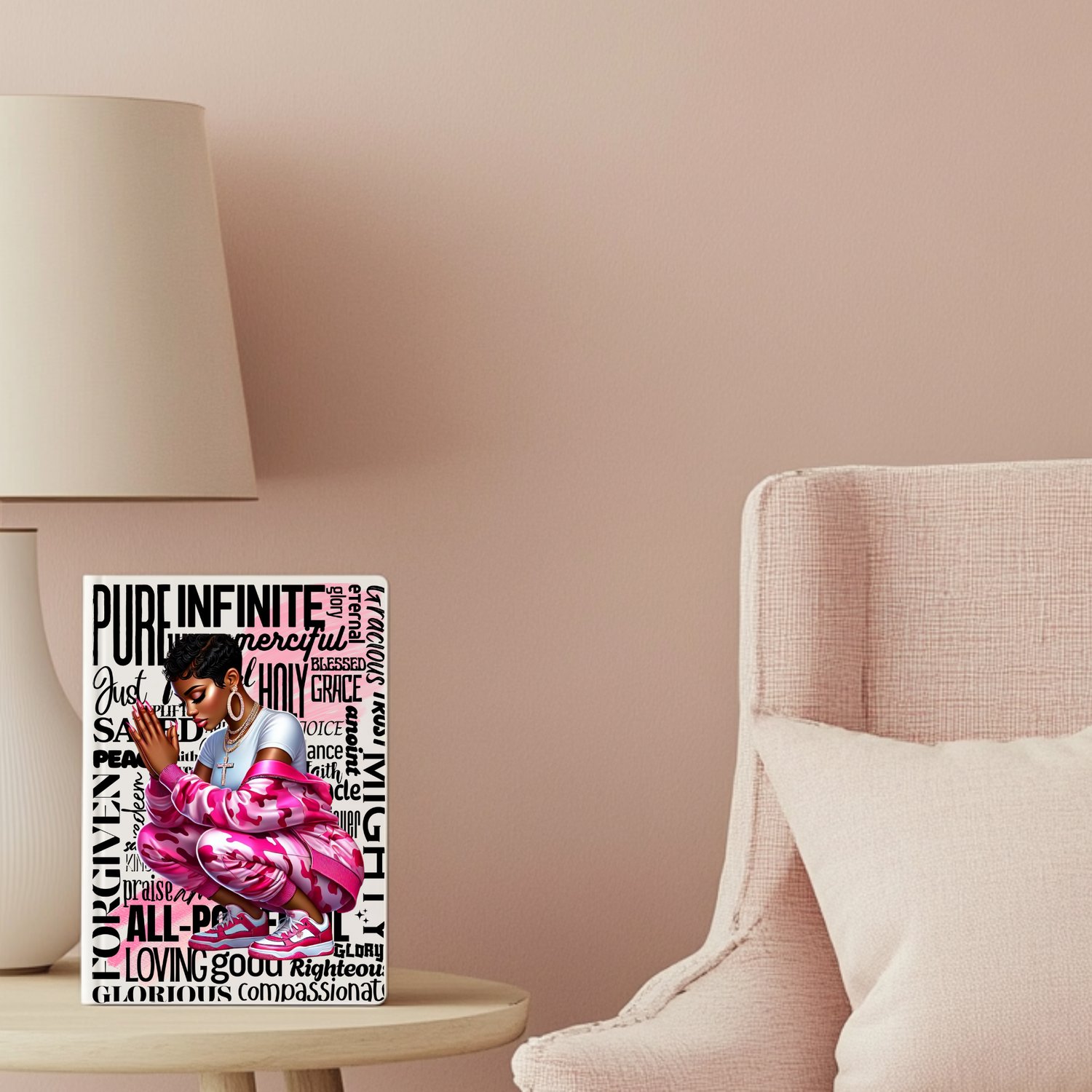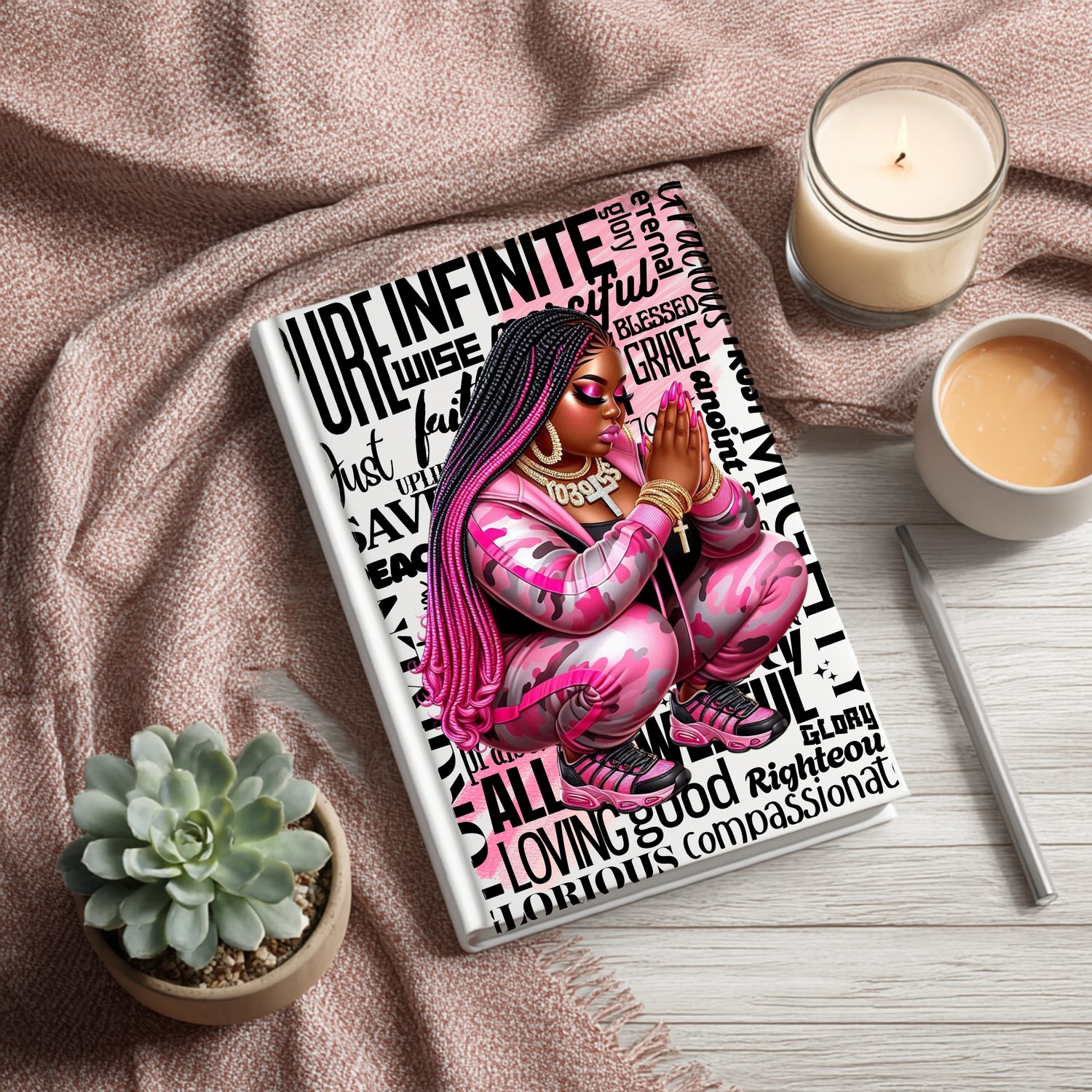 This digital set includes 4 powerful prayer journal covers featuring stylish Black women in pink camo fits, each kneeling in prayer. Sized perfectly at 5x7 inches, these high-resolution PNGs are ideal for journals, notebook covers, planner pages, or digital inserts.