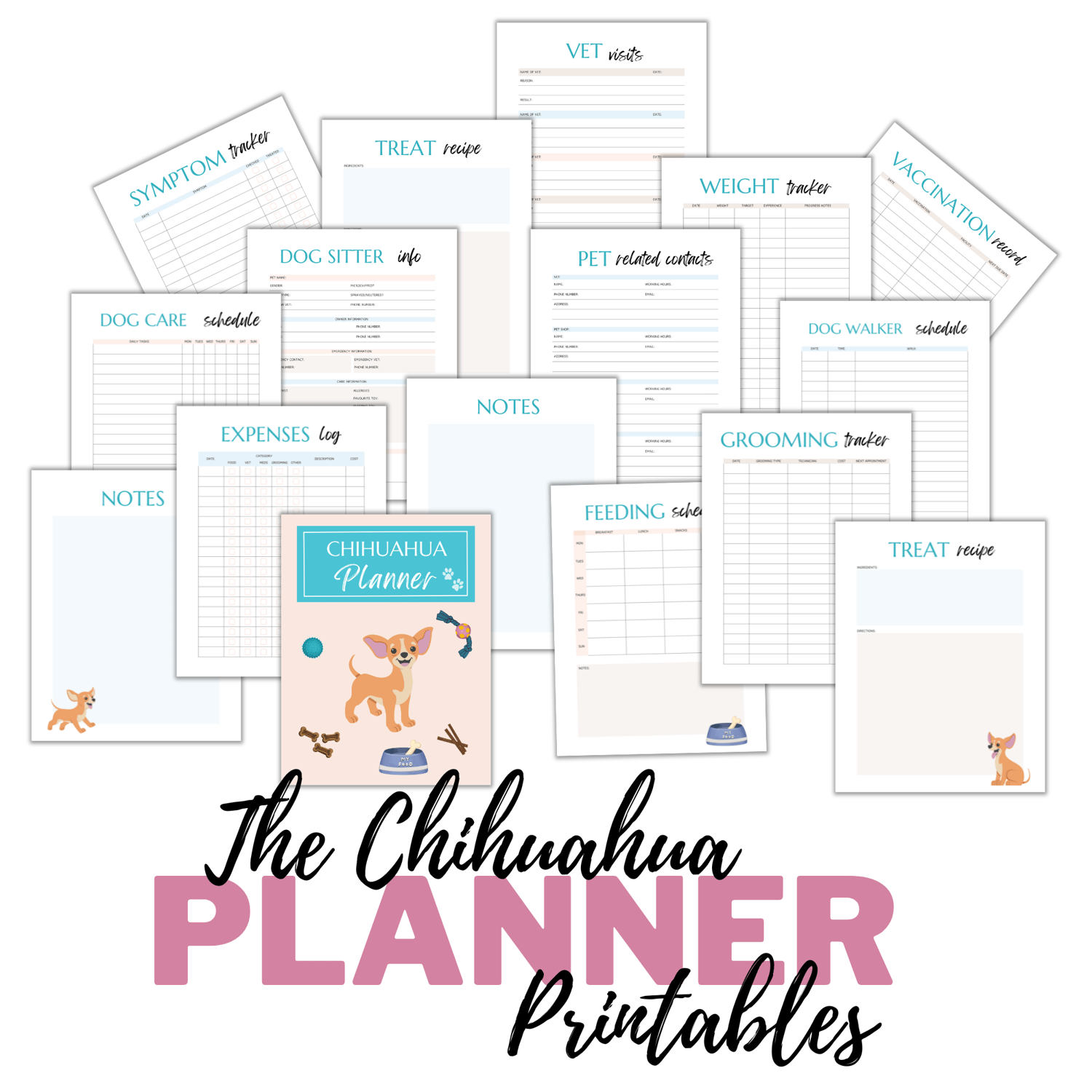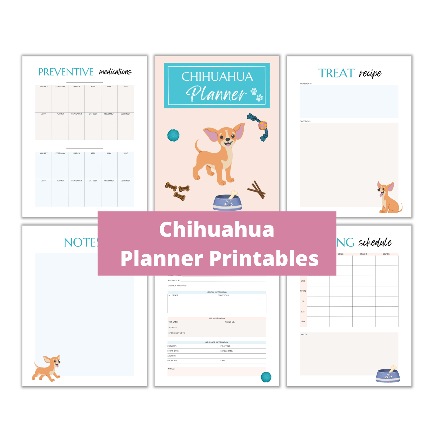 Keep everything about your Chihuahua in one easy place with this adorable and practical 25-page printable pet care planner. Whether you have one Chihuahua or a whole pack, this planner makes it simple to manage feeding, appointments, grooming, expenses, and more.