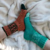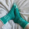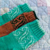 These socks display a rolling, stranded colorwork motif that could be interpreted as vines or waves. Most of the sock is pretty classic, vanilla sock territory with 26 rows of colorwork on the leg of the sock. This makes it the best of both worlds, something a little challenging plus easy knitting time!