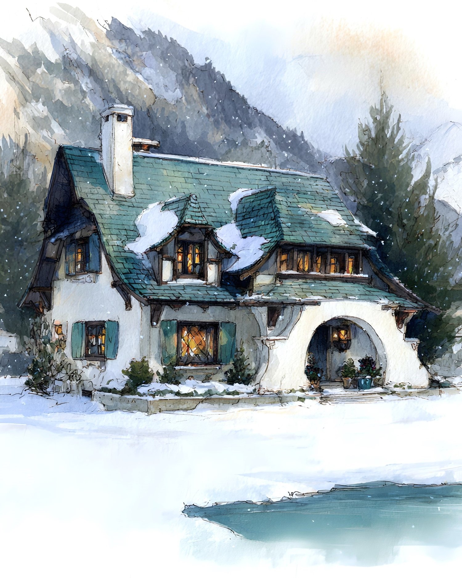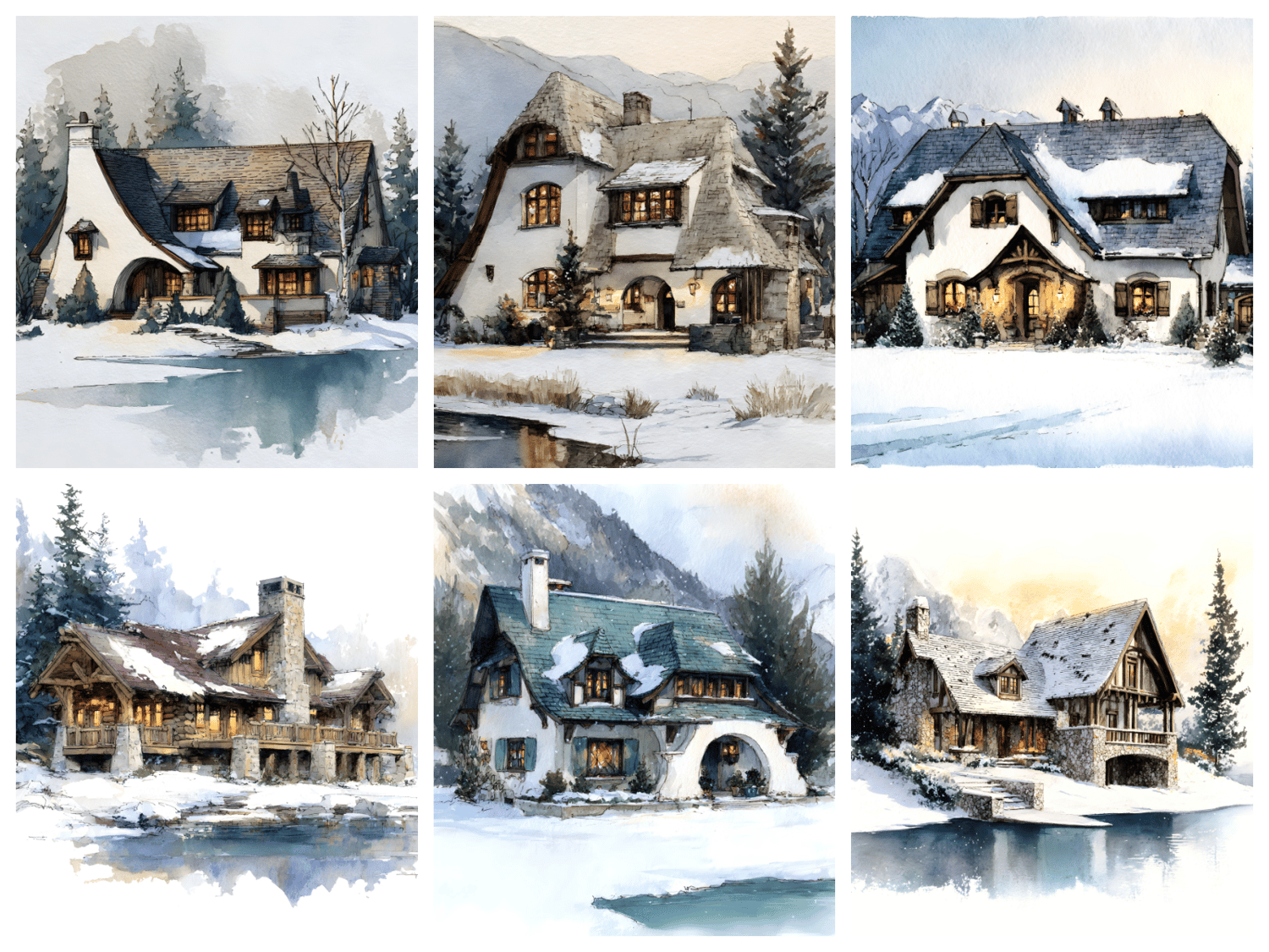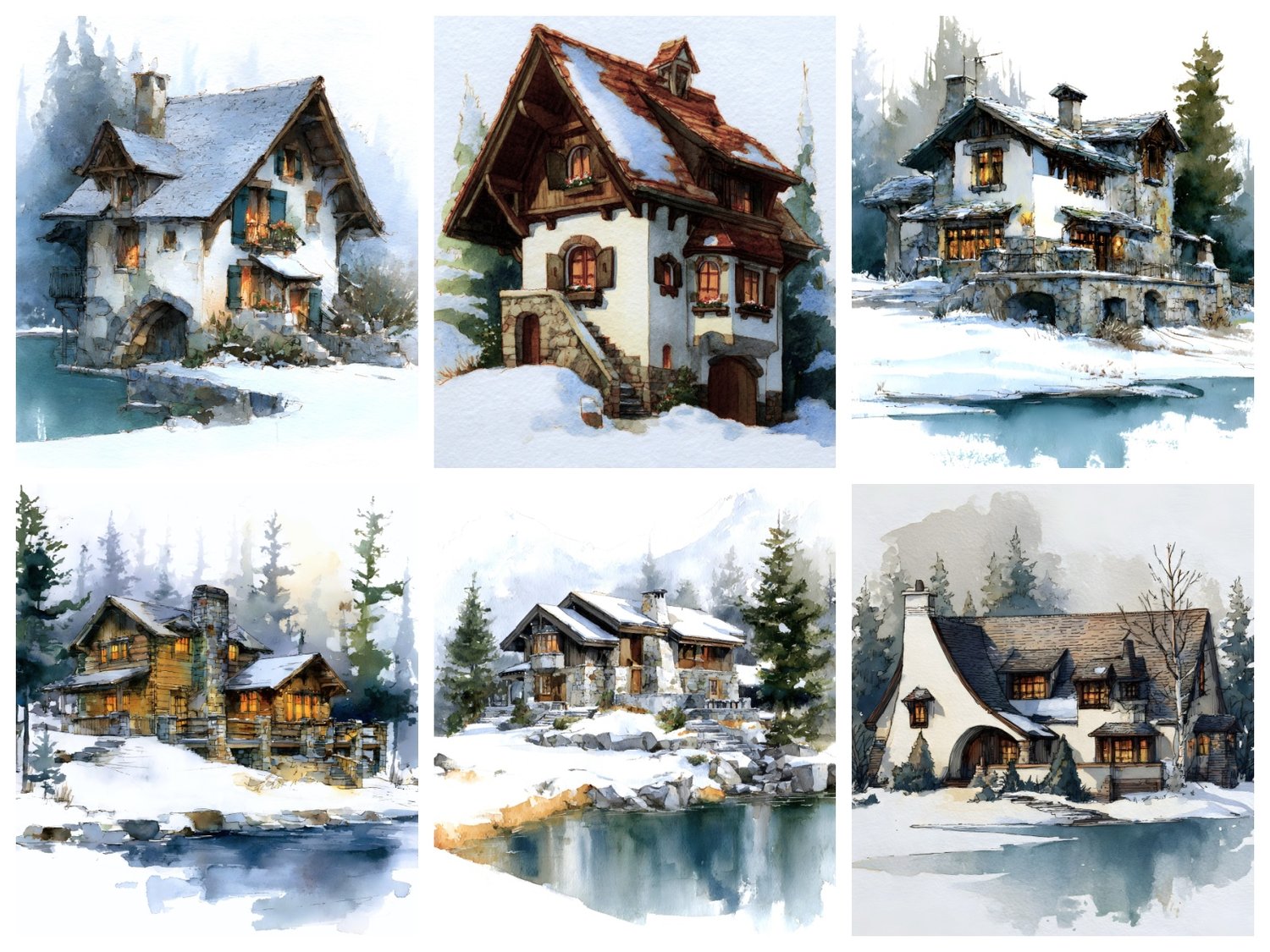 15 AI-generated JPG digital art prints – Winter at the Lake – Watercolor Snow Chalet Art Prints, whimsical manor illustration, fantasy house. High resolution 300 DPI, 8:10 format, 2400x3000 pixels, ready for print or digital use. Instant download, no physical product. Commercial license included.
