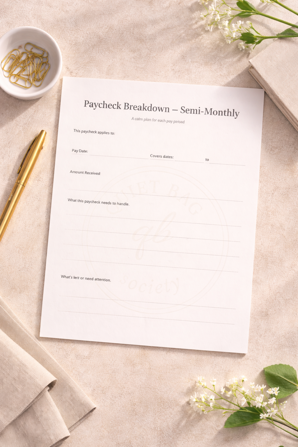 A calm, intentional worksheet designed to help you plan each paycheck, not just the month as a whole.