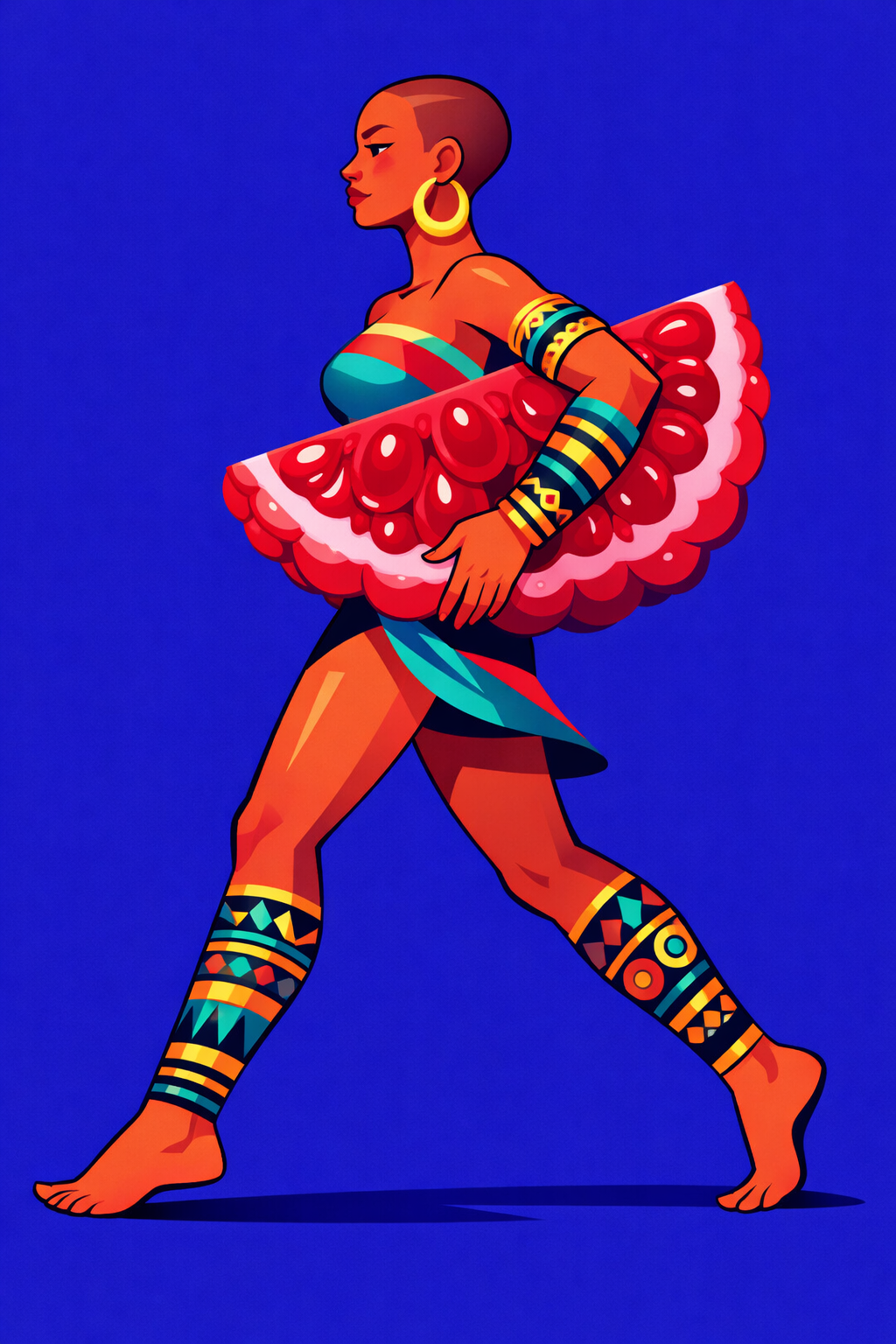 Illustration of a confident lady in side profile, walking forward with expressive motion.