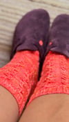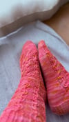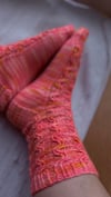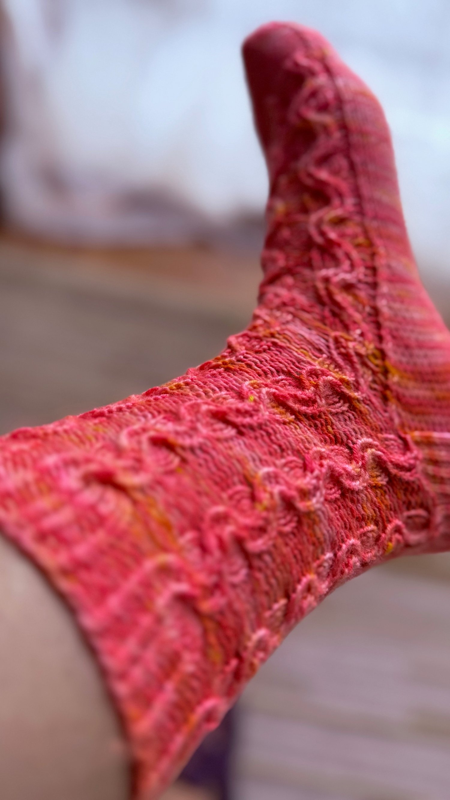 The design features delicate cables intertwined with twisted stitches, creating a timeless and sophisticated look. These socks offer a snug and comfortable fit, with just the right amount of stretch to hug your feet perfectly. Whether you choose a solid or tonal yarn, the twisted motifs will shine beautifully, making these socks a joy both to knit and to wear.