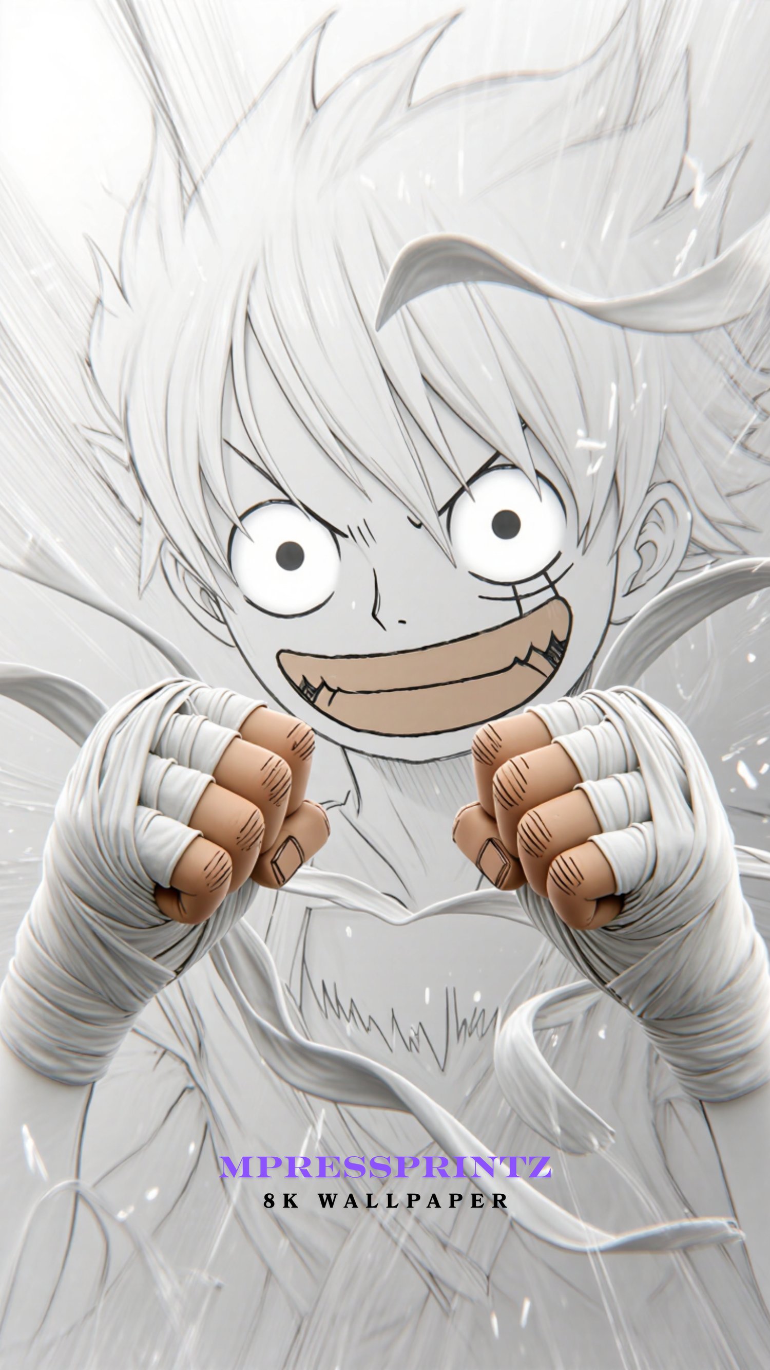 Unleash fearless energy with this ultra-clean 8K phone wallpaper inspired by Monkey D. Luffy. The artwork features a bold, sketch-style anime expression paired with Muay Thai–wrapped fists held forward in a confident fighting stance. The minimalist white background, flowing motion lines, and cinematic depth create a powerful yet playful visual that feels dynamic and uplifting on any phone screen.