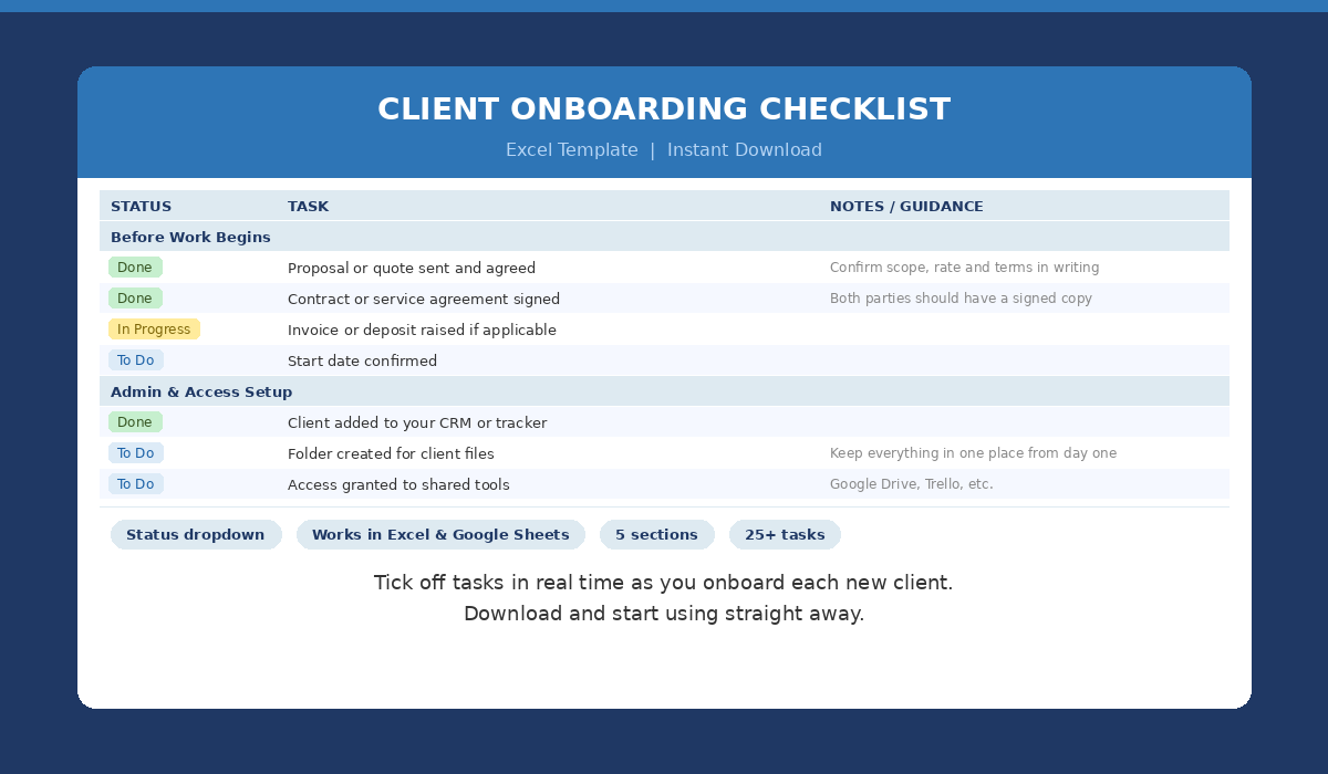 The same thorough client onboarding checklist, in an interactive Excel format you can work through and tick off as you go.