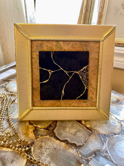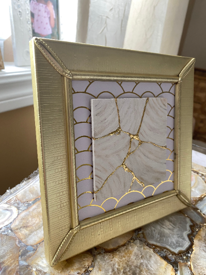 This is a hand painted faux Kintsugi tile framed with a beautiful gold frame.