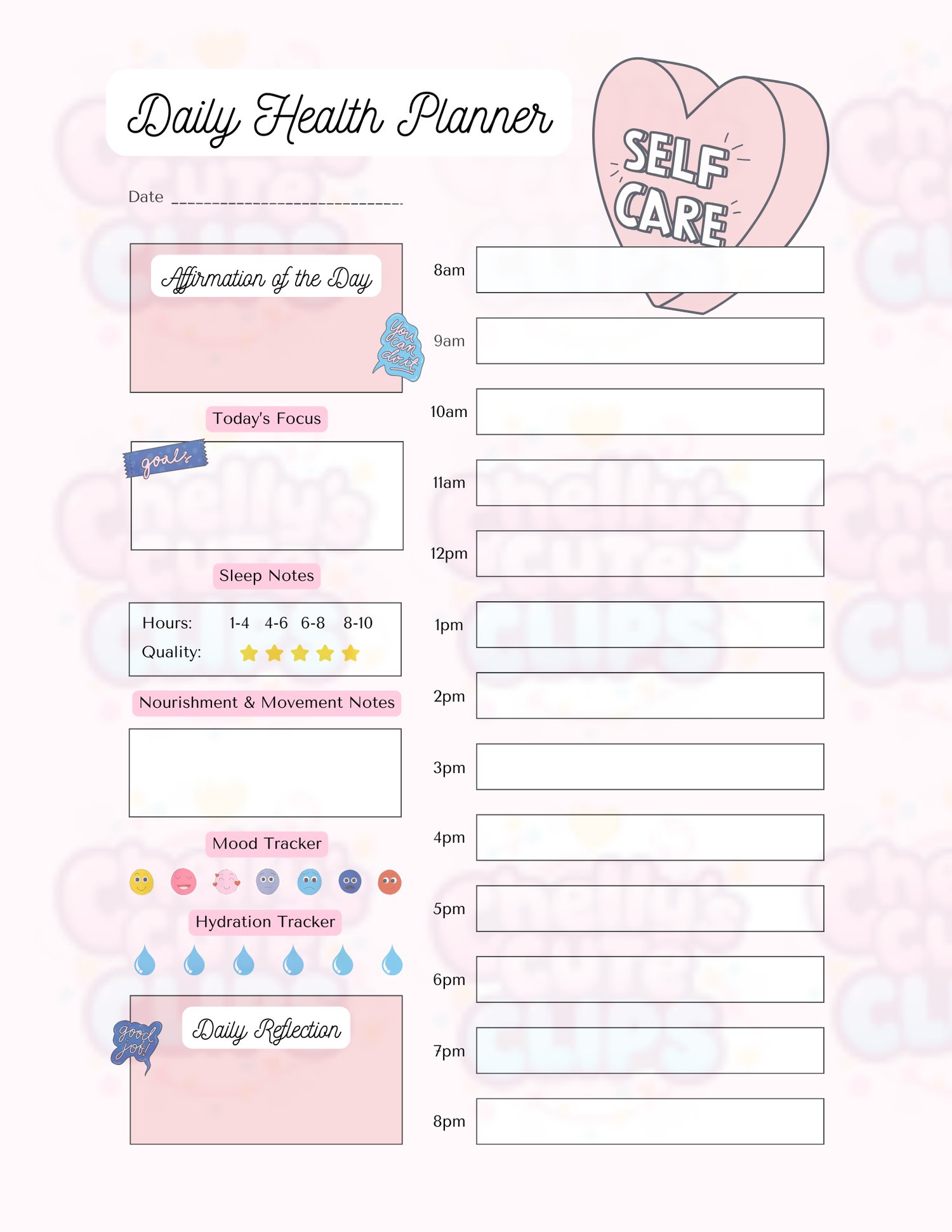 Pink & White Cute Self Care Daily Health Planner β Printable PDF (1 Page)