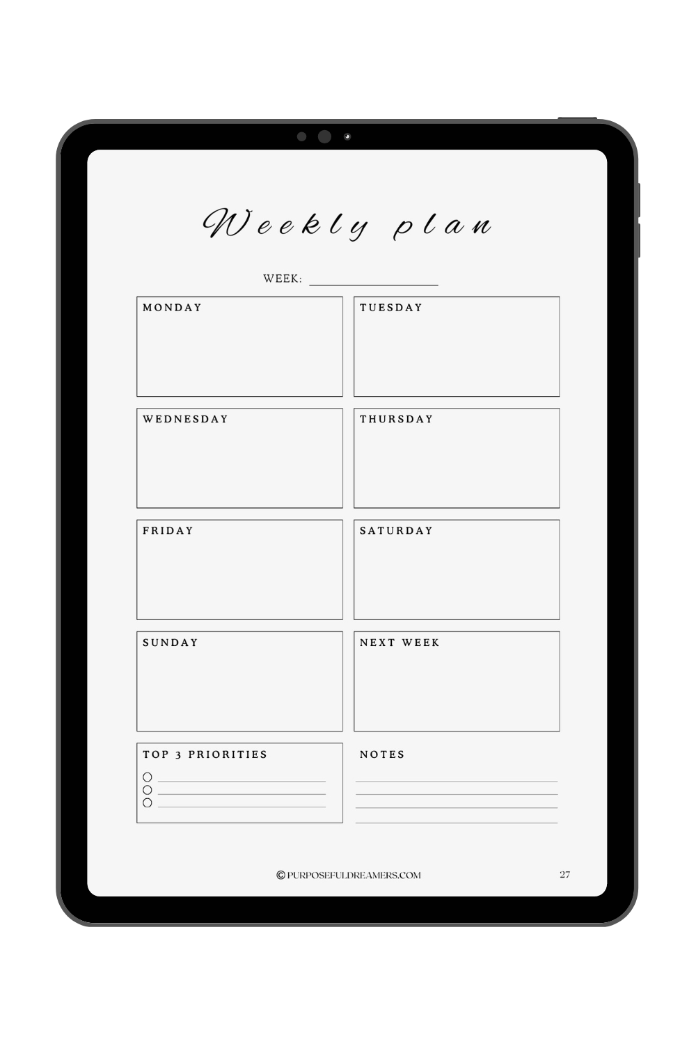 - Weekly Planning:Â Eisenhower Matrix, weekly overview, weekly planner, weekly review