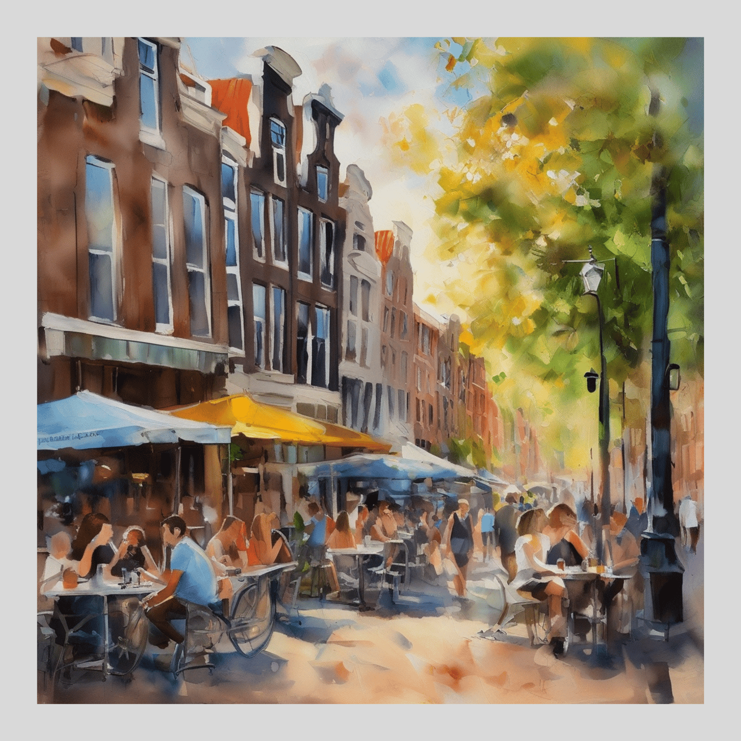 Amsterdam city.summer. Cafes. Passersby, sidewalks. Oil colors.