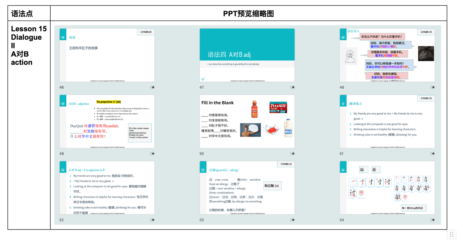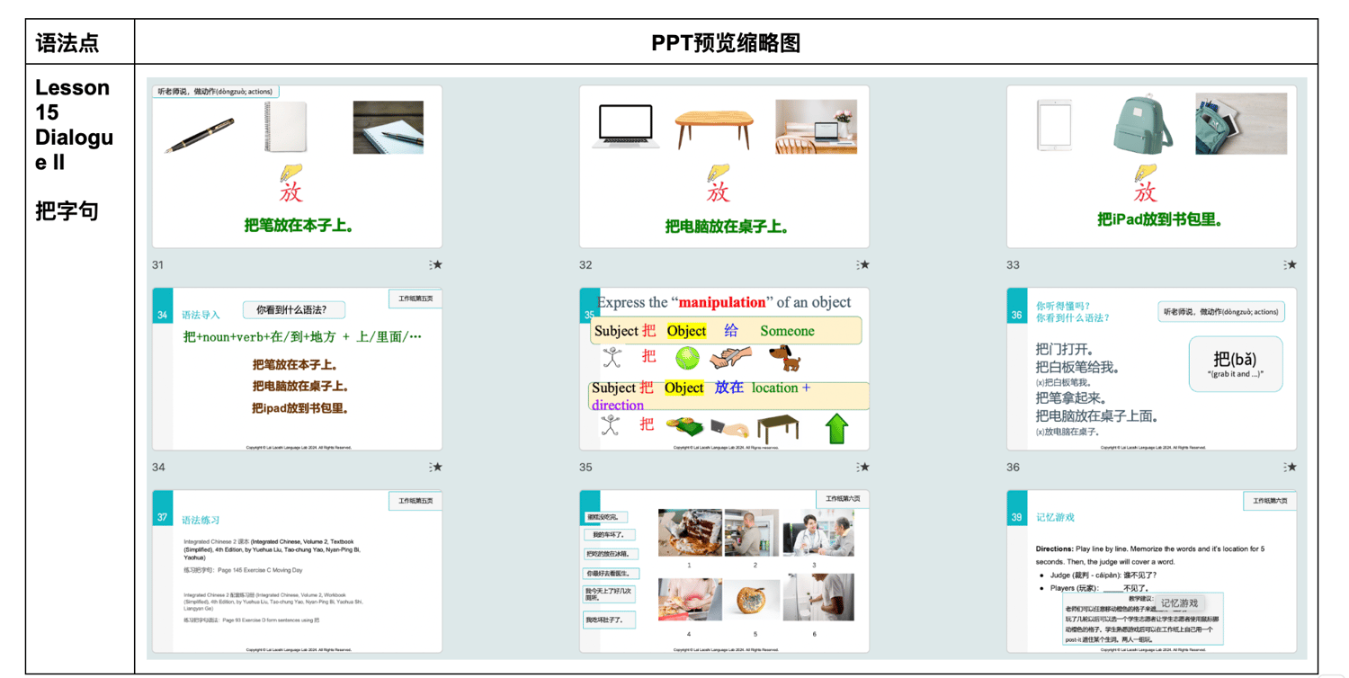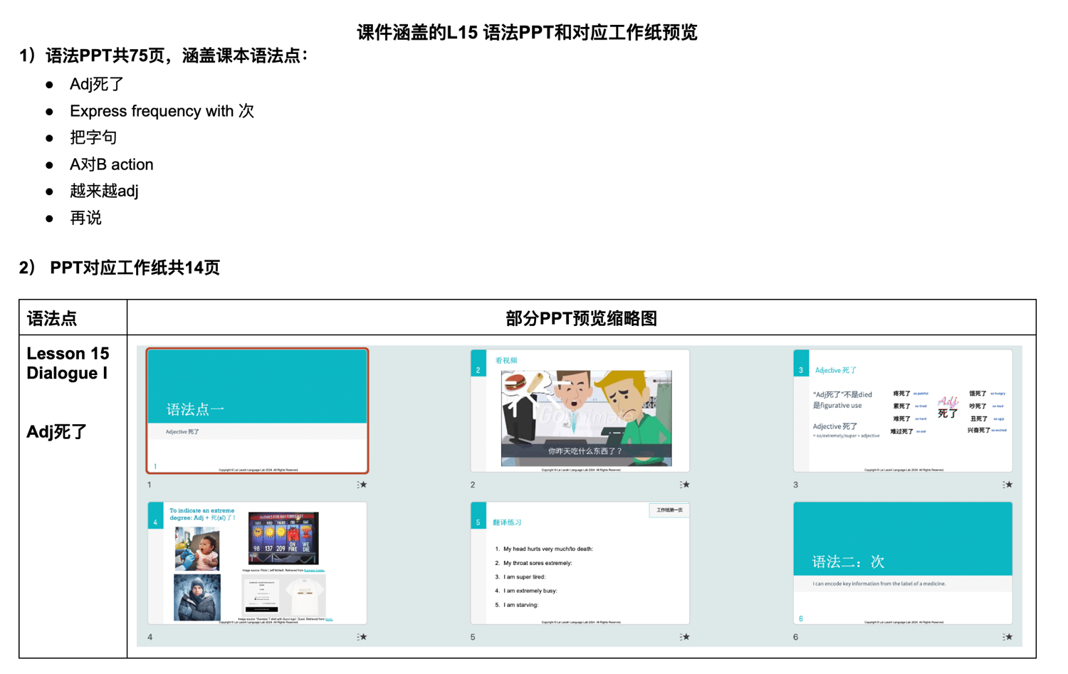本语法PPT的特色:a) 使用真实语料引入语法点;2)利用TPRS小故事带入语法点;3)每个语法点引入后附有各种练习帮助加强学生对语法点的的掌握。