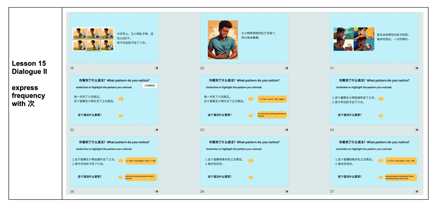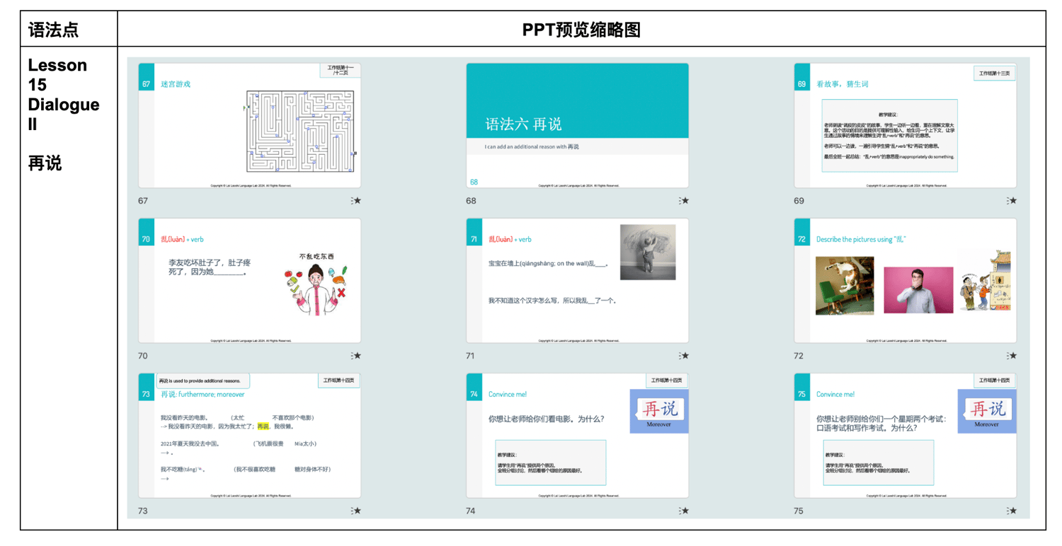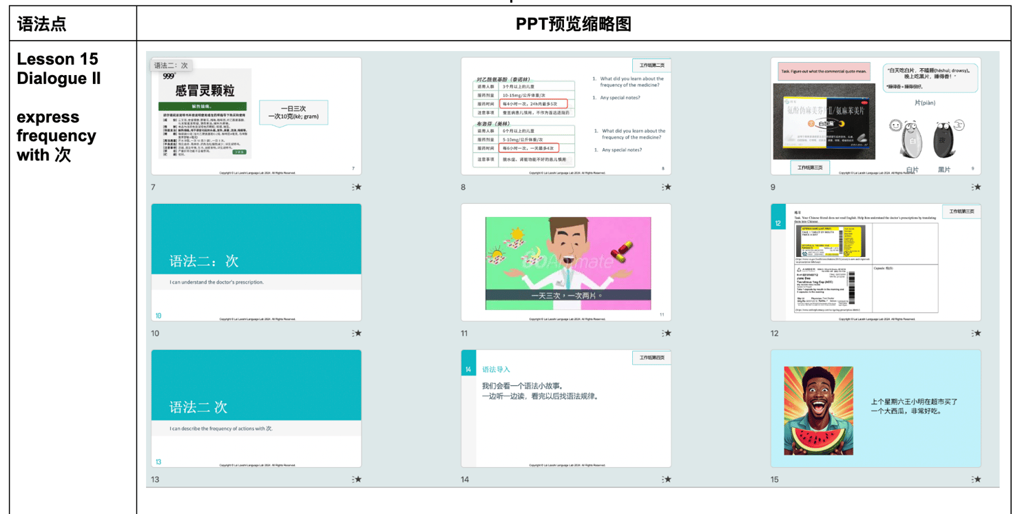 本语法PPT的特色:a) 使用真实语料引入语法点;2)利用TPRS小故事带入语法点;3)每个语法点引入后附有各种练习帮助加强学生对语法点的的掌握。