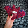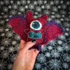 A red amigurumi cyclops bat plushie with a bowtie accessory.