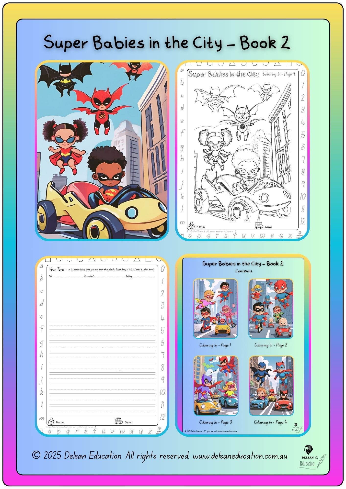 This colouring booklet has 9 pages to colour, and 3 pages for story writing. It is designed as a fun treat for young learners, igniting imagination and narrative, with a light touch of literacy and numeracy on the edges. Teachers can use it for calming filler activities throughout the day. The coloured contents pages offer inspiration to help students choose their own colours when working through the sheets.