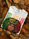 God Says I Am vibrant color DTF printed design on 100% short sleeve cotton t-shirt. Available in 3 colors!